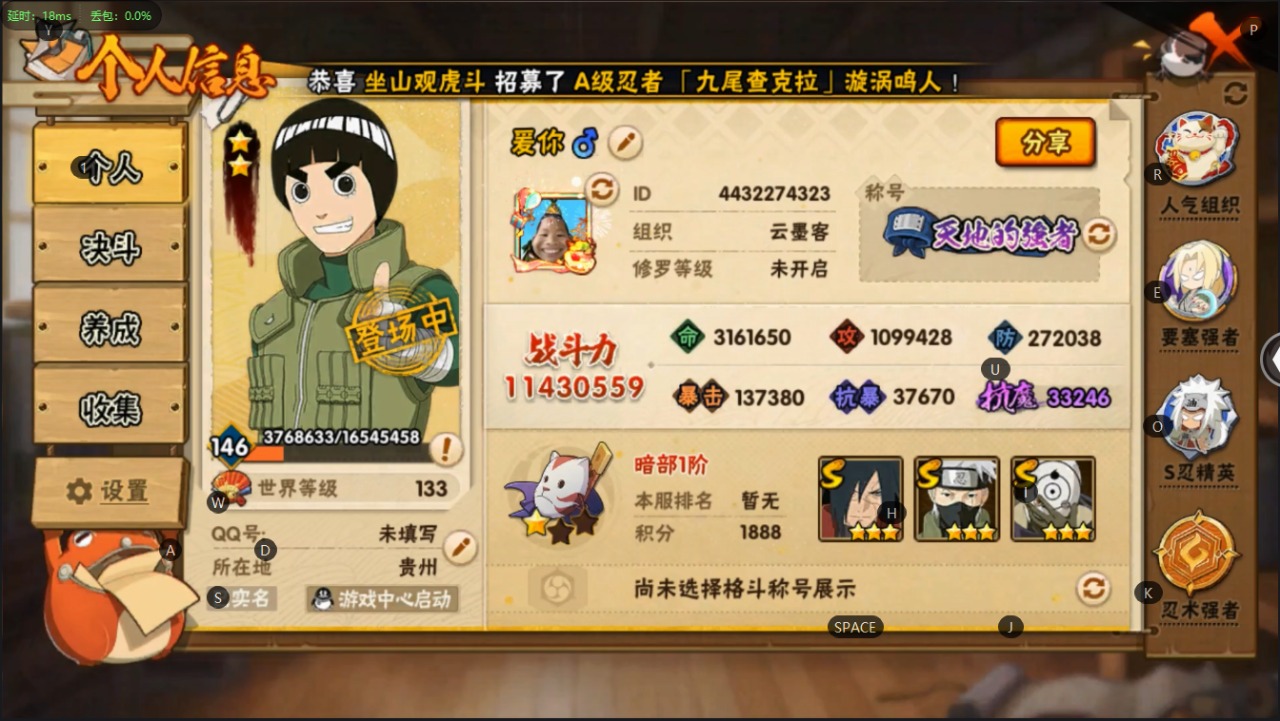 【hy1747】v11/战力1072w/s忍18/a忍36/3星纲手/2星我爱罗「疾风传」/2星宇智波鼬/2星飞段「死司凭血」/2星旗木卡卡西「元气夏日」/3星宇智波鼬「秽土转生」/2星迈特凯/2星长门「青年」/3星宇智波带土「忍界大战」/2星蝎/3星佩恩「天道」/2星照美冥「五代目水影」/3星波风水门/3星漩涡鸣人「九喇嘛连结」/3星波风水门「秽土转生」/2星秋道丁次「忍界大战」/2星漩涡博人「桃式显现」/2星旗木卡卡西「万花筒写轮眼」/2星奇拉比「忍界大战」/3星千手扉间「秽土转生」/3星千手柱间「秽土转生」/2星神秘面具男「忍者之路」/3星罗砂「四代目风影」/2星波风水门「青年」/3星自来也「舞之豪杰」/2星千手扉间「漂泊武士」/3星迈特凯「死门」/3星猿飞日斩/2星药师兜「半蛇斗篷」/2星飞段/2星猿飞阿斯玛/2星漩涡鸣人「仙人模式」/3星春野樱「忍界大战」/2星志村团藏/2星我爱罗「忍界大战」/2星迪达拉/2星干柿鬼鲛/3星宇智波斑「木叶创立」/3星大蛇丸/2星小南「漂泊浪客」/2星漩涡鸣人「九尾查克拉」/2星艾「青年」/3星大野木「忍界大战」/2星不缘/2星宇智波佐助「须佐能乎」/2星千代「近松十人卫」/2星大蛇丸「晓」