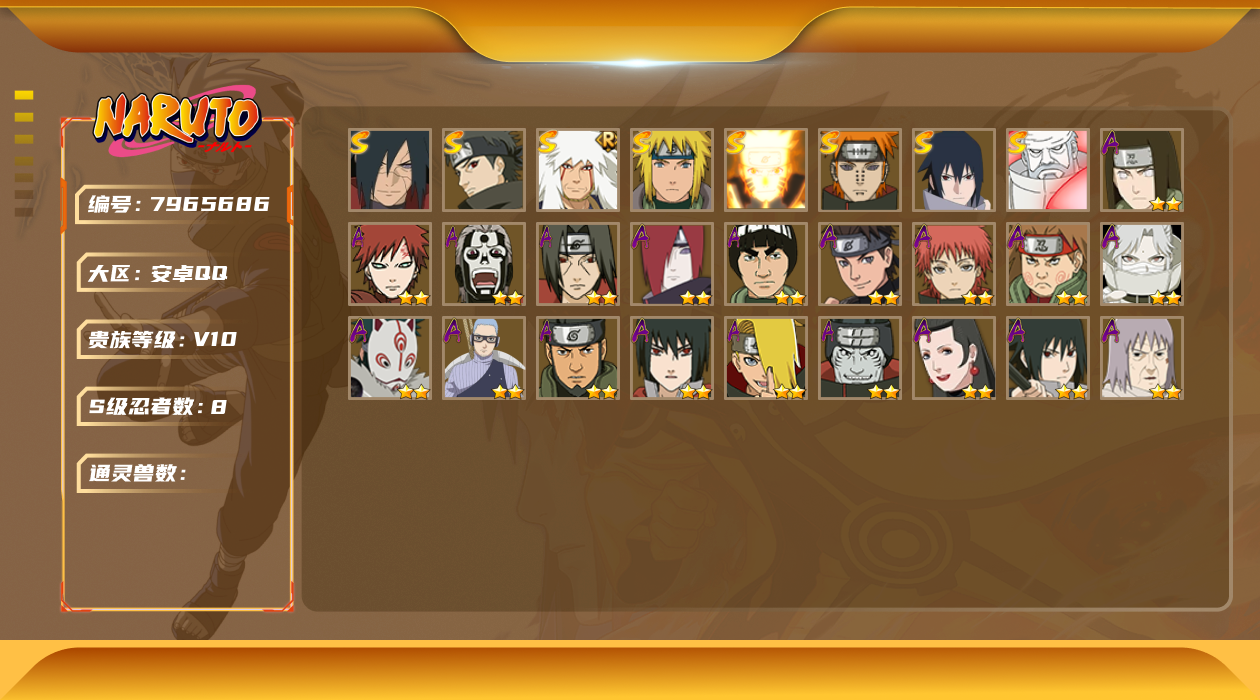 [7965686]xr37275-战力449w-8s级忍者数-20a级忍者数 【s级忍者】:宇智波斑「秽土转生·解」3星,宇智波止水「须佐能乎」3星,自来也「舞之豪杰」3星,波风水门3星,漩涡鸣人「九喇嘛连结」3星,佩恩「天道」3星,宇智波佐助「永恒万花筒」3星,大筒木金式3星 【a级忍者】:长门「青年」2星,迪达拉2星,飞段「死司凭血」2星,干柿鬼鲛2星,迈特凯2星,我爱罗「疾风传」2星,蝎2星,猿飞阿斯玛2星,猿飞日斩「火影继承人」2星,宇智波鼬2星,宇智波佐助「须佐能乎」2星,宇智波佐助「万花筒写轮眼」2星,日向宁次「忍界大战」2星,长十郎「六代目水影」2星,卑留呼「火之意志继承者」2星,神秘面具男「忍者之路」2星,秋道丁次「忍界大战」2星,千代「近松十人卫」2星,不缘2星,宇智波泉奈2星