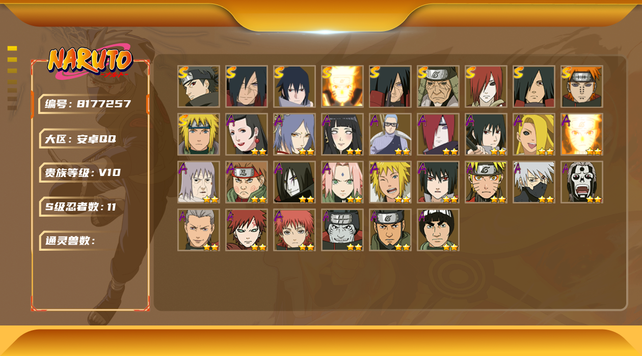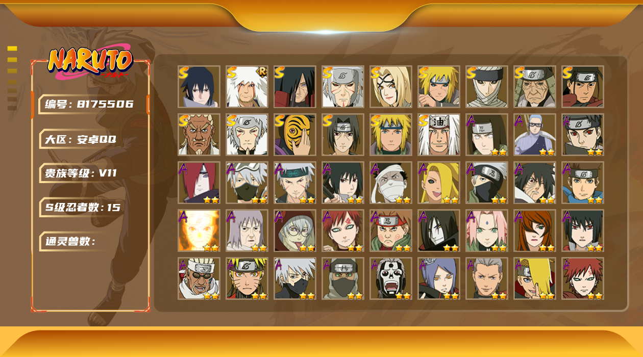 [8175506]战斗力:723w;段位:暗部2阶;vip11级;总魅力值:4870;魅力等级:26;s忍16个;a忍37个,通灵兽17个,s忍:永恒万花筒宇智波佐助,自来也(普通),舞之豪杰自来也,百豪纲手,波风水门(普通),秽土转生波风水门,秽土转生猿飞日斩,千手扉间(普通),秽土转生千手扉间,千手柱间(普通),秽土转生宇智波斑,须佐能乎宇智波鼬,神秘面具男(普通),四代目雷影艾,二代目土影无,博人传大筒木金式, ;a忍:5星猿飞阿斯玛(普通),5星迈特凯(普通),5星干柿鬼鲛(普通),4星蝎(普通),4星飞段(普通),3星疾风传我爱罗,奇拉比(普通),万花筒写轮眼宇智波佐助,须佐能乎宇智波佐助,忍界大战日向宁次,五代目水影照美冥,漂泊武士桃地再不斩,忍界大战旗木卡卡西,百豪春野樱,宇智波止水(普通),九尾查克拉漩涡鸣人,万花筒写轮眼旗木卡卡西,元气夏日旗木卡卡西,青年波风水门,漂泊武士千手扉间,近松十人卫千代,忍界大战秋道丁次,忍界大战我爱罗,仙人模式漩涡鸣人,地怨虞角都,晓大蛇丸,宇智波鼬(普通),木叶上忍猿飞木叶丸,四代目土影黑土,青年长门,迪达拉(普通),秽土转生迪达拉,小南(普通),死司凭血飞段,暴怒宇智波带土,六代目水影长十郎,半蛇斗篷药师兜, ;通灵兽:忍犬(普通),蓝蛇,蛤蟆吉,忍龟,山椒鱼,镰鼬,猿魔,蜃,蛤蟆仙人,鲛鲨,蛤蟆健,乌鸦(普通),蛞蝓(普通),蛤蟆龙,怒鬼(普通),蛤蟆广,砂之守鹤时装:百战波风水门,蜀面豪杰舞之豪杰自来也;详情看图;【562区】【安卓qq】【可二次实名】
