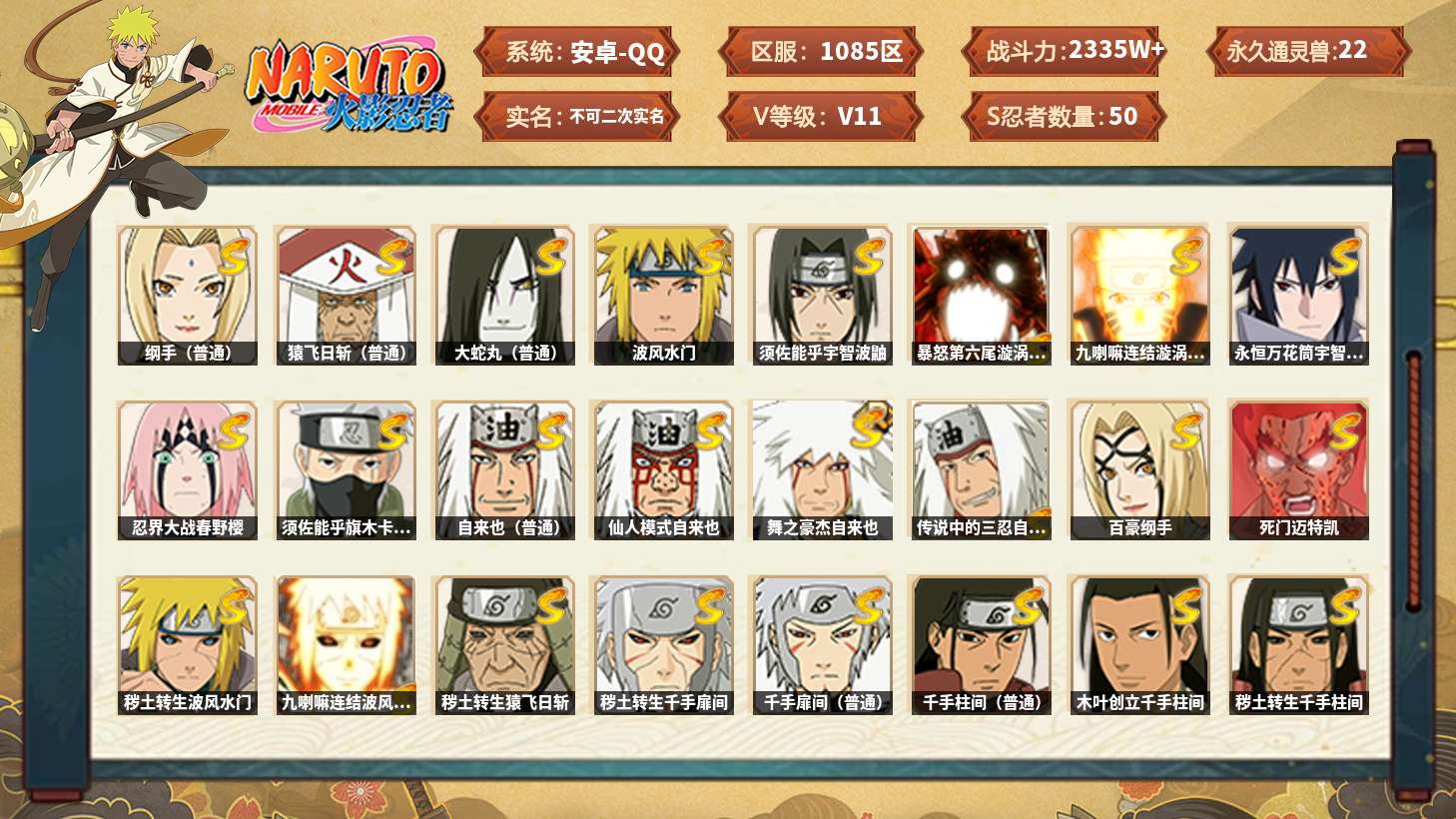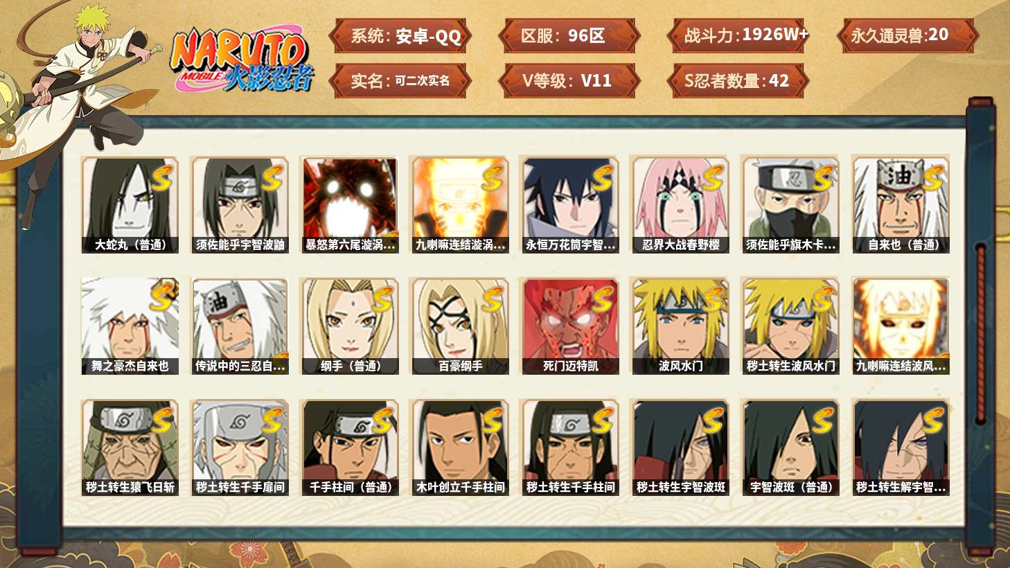 [14651458]v13 19s忍 34a忍 19通灵 798.8w战力 可二次 可修改实名 【s级忍者】:艾「忍界大战」宇智波斑「秽土转生·解」千手柱间·木叶创立宇智波佐助「永恒万花筒」春野樱 「忍界大战」大筒木金式「博人传」漩涡鸣人 「九喇嘛连结」大野木 「忍界大战」迈特凯「死门」自来也 「舞之豪杰」旗木卡卡西「须佐能乎」自来也 「传说中的三忍」漩涡鸣人 「暴怒·第六尾」宇智波鼬「秽土转生」长门「秽土转生」宇智波鼬 「须佐能乎」佩恩「天道」波风水门大蛇丸