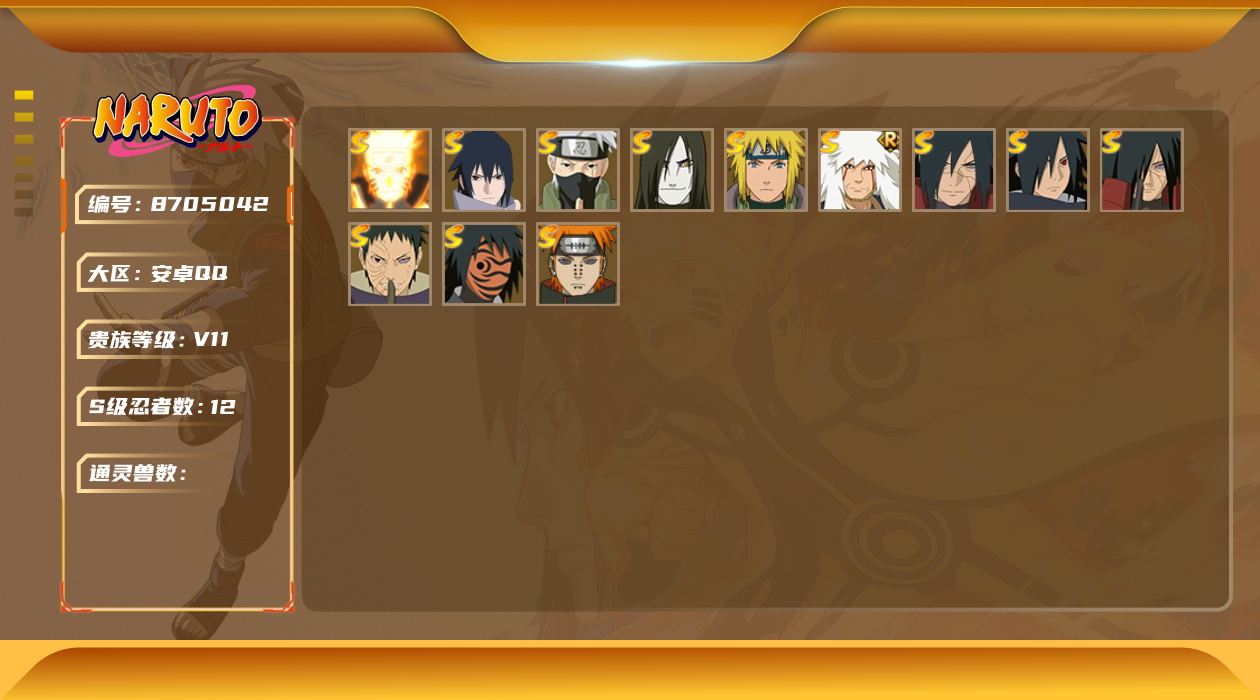 [8705042]v11 12s 可二次 s级忍者:宇智波斑「秽土转生·解」宇智波佐助「永恒万花筒」神秘面具男 「红夜之刃」漩涡鸣人 「九喇嘛连结」宇智波斑 「木叶创立」宇智波带土 「忍界大战」自来也 「舞之豪杰」旗木卡卡西「须佐能乎」宇智波斑「秽土转生」佩恩「天道」波风水门大蛇丸