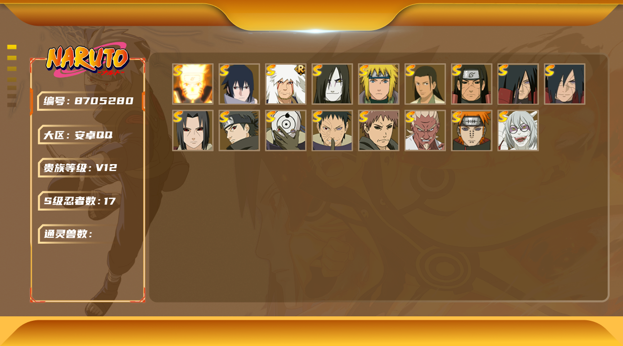 [8705280]v10 17s 可二次 可修改实名 s级忍者:宇智波止水「须佐能乎」艾「忍界大战」宇智波斑「秽土转生·解」千手柱间·木叶创立宇智波佐助「永恒万花筒」漩涡鸣人 「九喇嘛连结」宇智波带土 「忍界大战」千手柱间「秽土转生」罗砂「四代目风影」自来也 「舞之豪杰」宇智波鼬「秽土转生」药师兜「仙人模式」宇智波斑「秽土转生」“宇智波斑” 「白面具」佩恩「天道」波风水门大蛇丸
