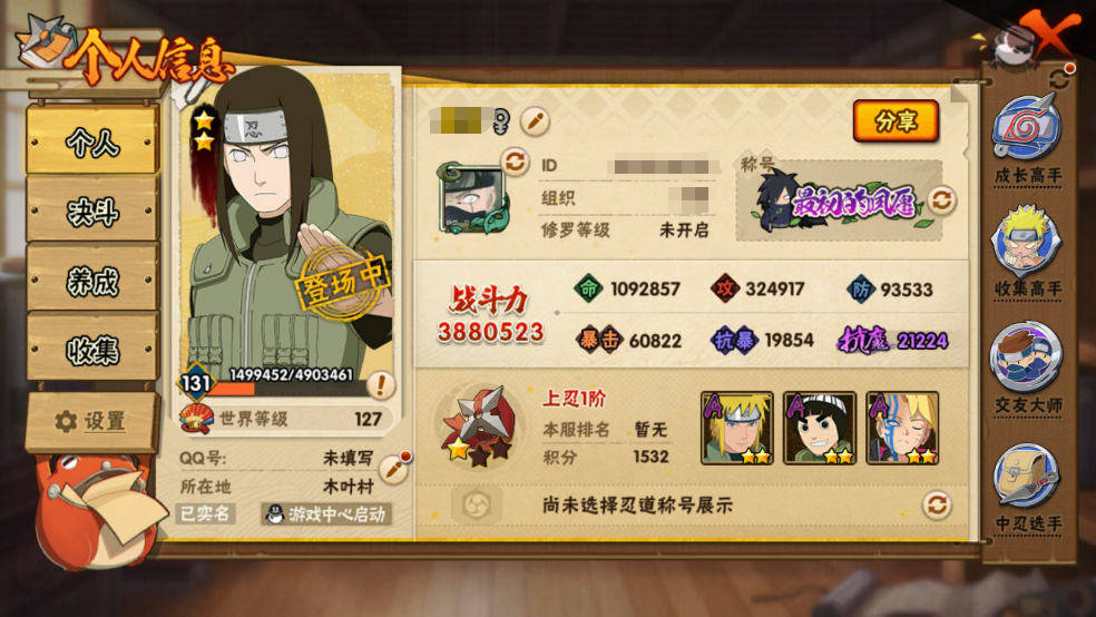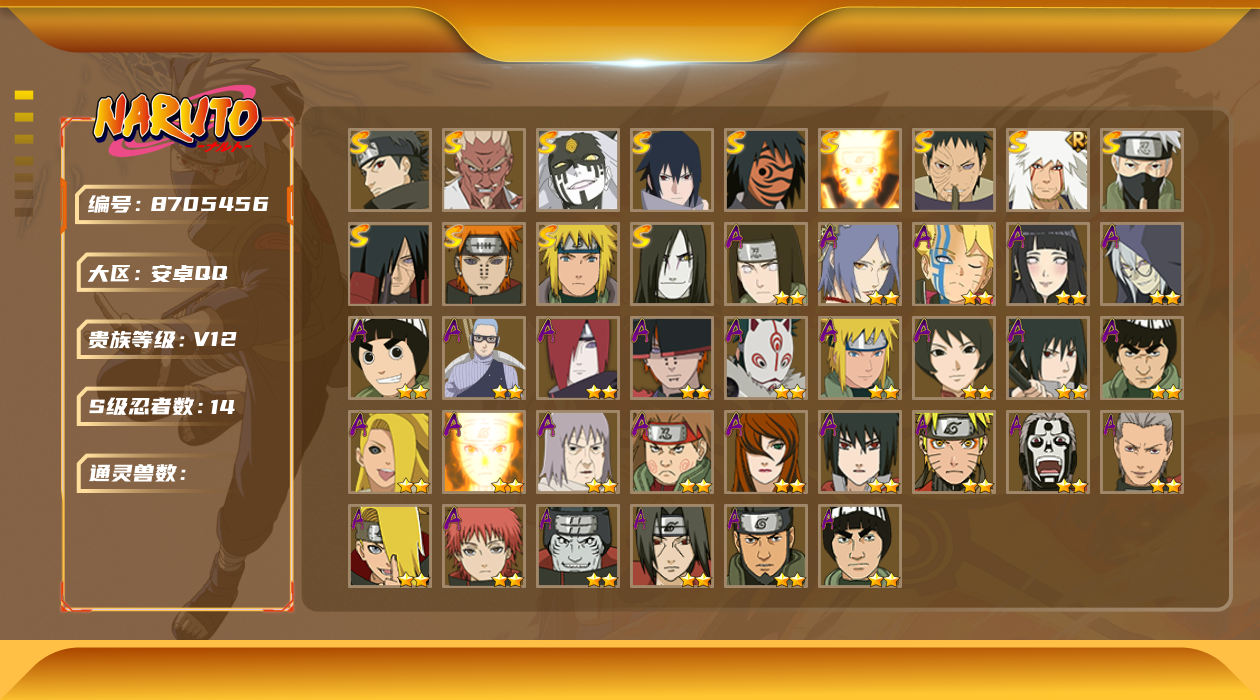 "【安卓q-3616区-v5-300万战-4s-15a-87忍者-13通灵】 s; 豪杰自来也 水门 百战佩恩 宇智波佐助 a;迈特凯 我爱罗 李洛克 "