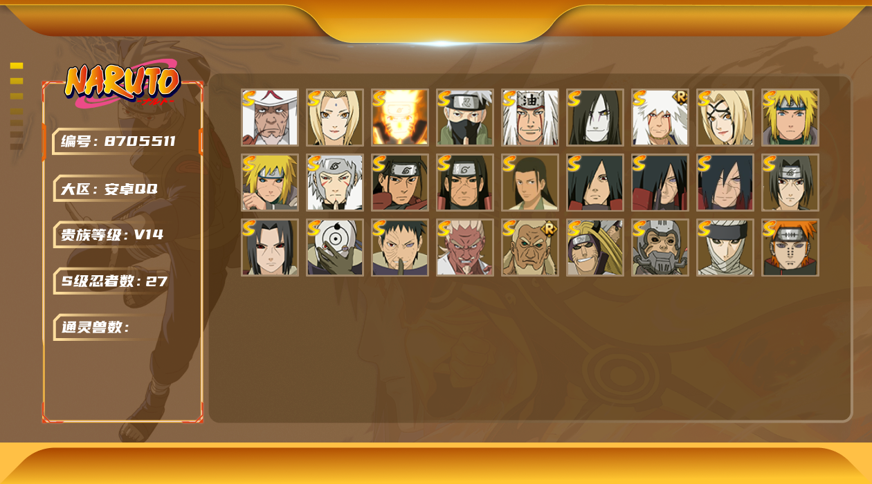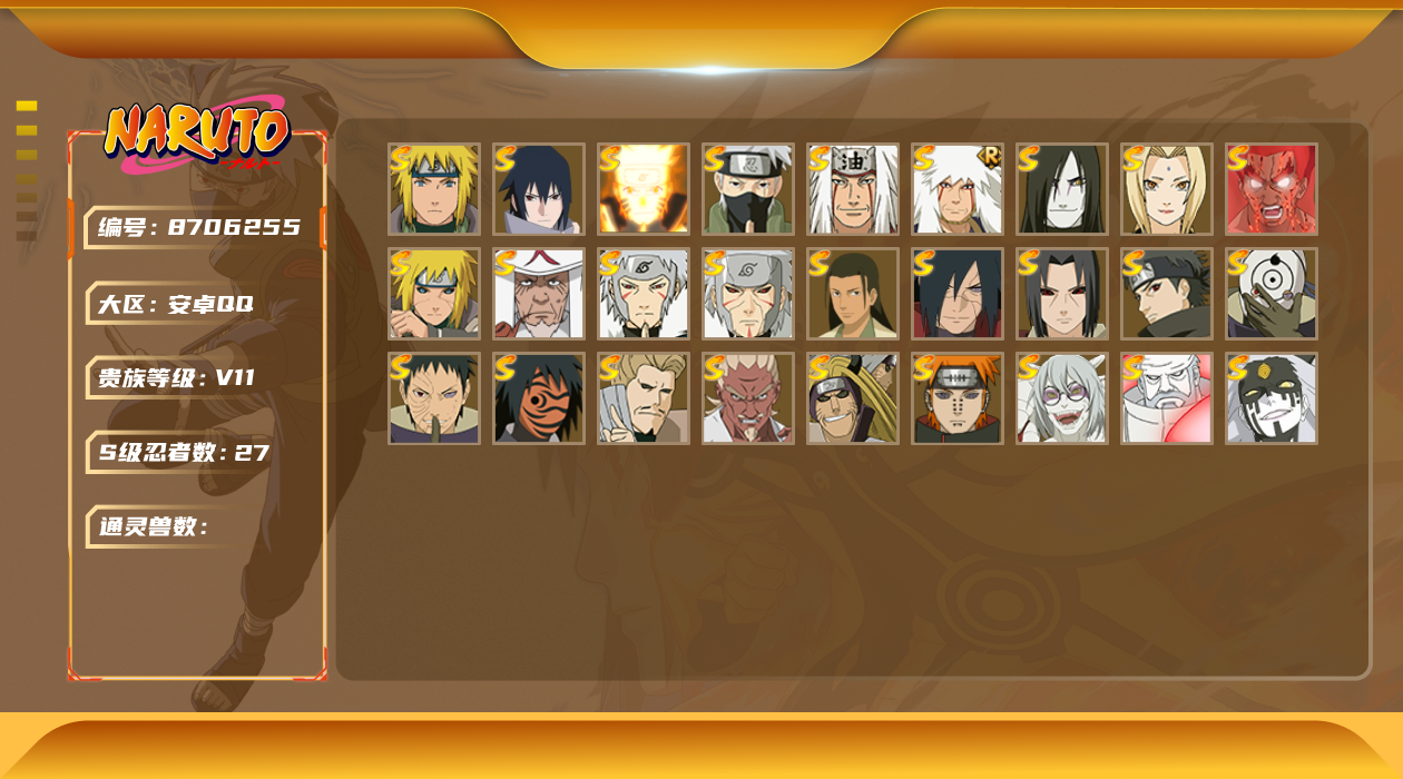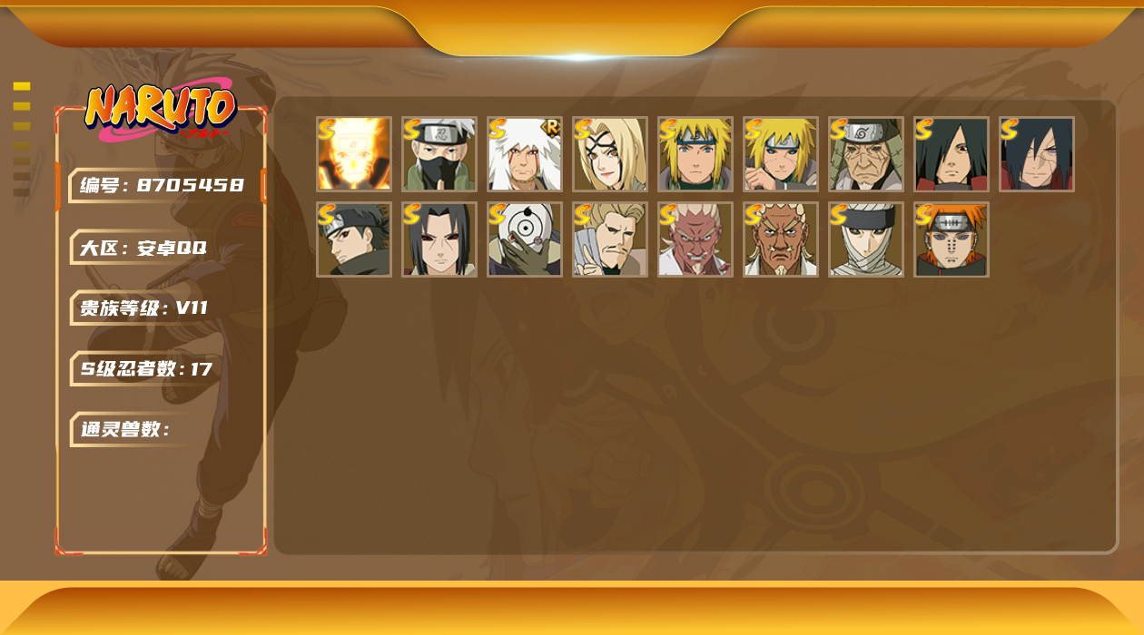 [8705458]v11 17s 可二次 可修改实名 s级忍者:宇智波止水「须佐能乎」艾「忍界大战」宇智波斑「秽土转生·解」漩涡鸣人 「九喇嘛连结」自来也 「舞之豪杰」旗木卡卡西「须佐能乎」宇智波鼬「秽土转生」“宇智波斑” 「白面具」纲手「百豪」波风水门「秽土转生」无「二代目土影」猿飞日斩「秽土转生」鬼灯幻月「二代目水影」宇智波斑艾「四代目雷影」佩恩「天道」波风水门
