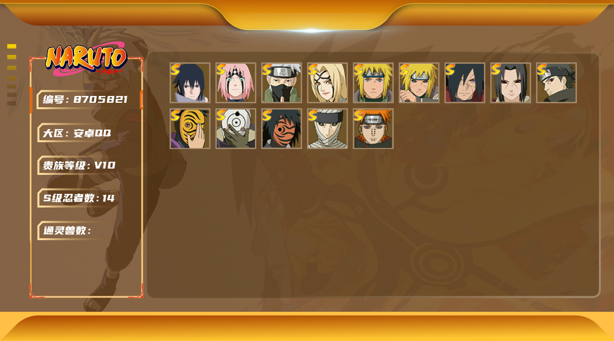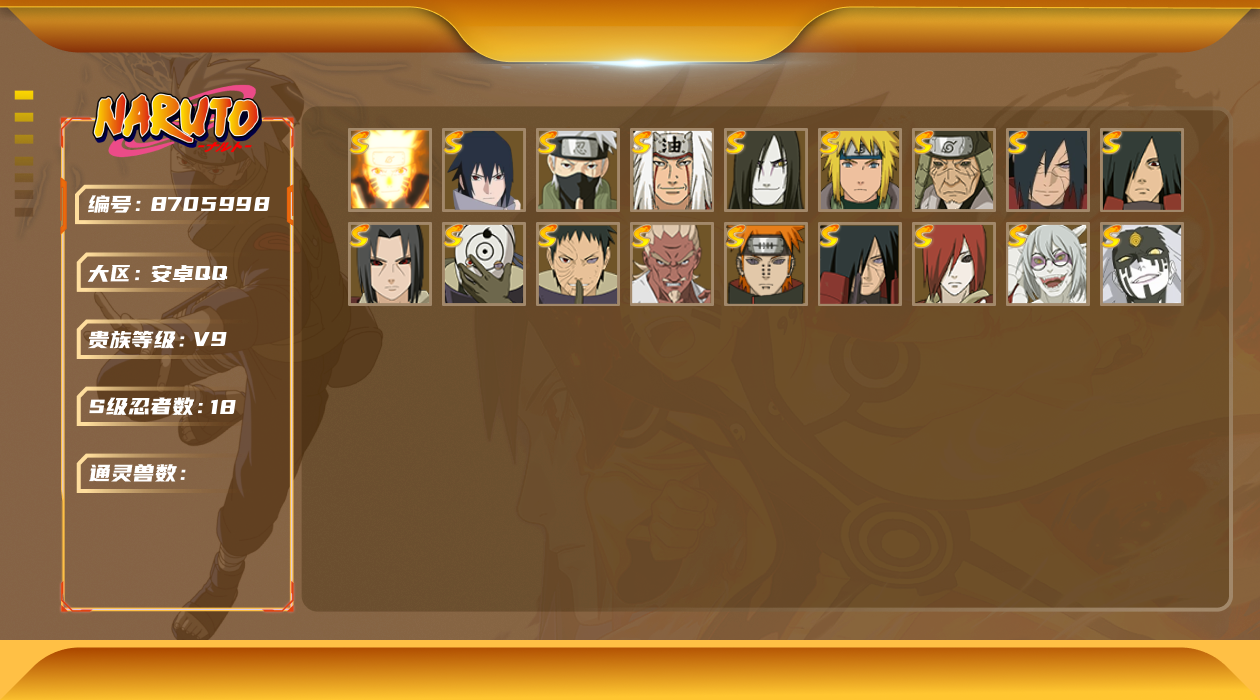 [8705998]v9 18s 可二次 s级忍者:艾「忍界大战」大筒木桃式宇智波斑「秽土转生·解」宇智波佐助「永恒万花筒」漩涡鸣人 「九喇嘛连结」宇智波带土 「忍界大战」旗木卡卡西「须佐能乎」宇智波鼬「秽土转生」药师兜「仙人模式」宇智波斑「秽土转生」“宇智波斑” 「白面具」猿飞日斩「秽土转生」长门「秽土转生」宇智波斑佩恩「天道」波风水门大蛇丸自来也