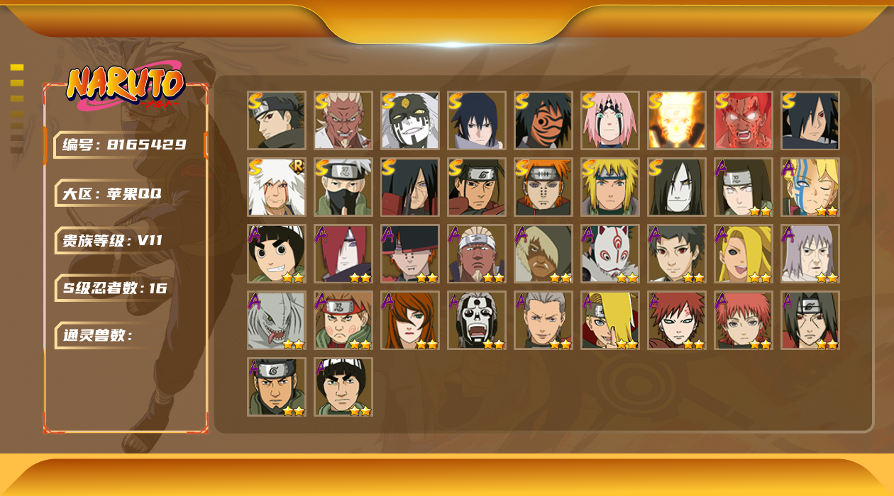 [8165429]m1603战斗力:771w;段位:见习1阶;本服排名441;战区排名:未上榜;vip11级;总魅力值:7200;魅力等级:32;s忍17个;a忍24个,通灵兽16个,s忍:九喇嘛连结漩涡鸣人,永恒万花筒宇智波佐助,忍界大战春野樱,须佐能乎旗木卡卡西,舞之豪杰自来也,死门迈特凯,波风水门(普通),千手柱间(普通),木叶创立千手柱间,大蛇丸,木叶创立宇智波斑,秽土转生解宇智波斑,须佐能乎宇智波止水,红夜之刃神秘面具男,忍界大战艾,天道佩恩,大筒木桃式, ;a忍:5星迈特凯(普通),4星猿飞阿斯玛(普通),4星疾风传我爱罗,4星干柿鬼鲛(普通),3星六代目水影长十郎,忍者之路神秘面具男,宇智波泉奈,青年艾,青年长门,飞段(普通),忍界大战日向宁次,漂泊浪客佩恩六道,宇智波鼬(普通),迪达拉(普通),忍界大战李洛克,五代目水影照美冥,近松十人卫千代,蝎(普通),秽土转生迪达拉,五代目雷影达鲁伊,死司凭血飞段,新春限定宇智波止水,忍界大战秋道丁次,桃式显现漩涡博人, ;通灵兽:忍犬(普通),蓝蛇,蛤蟆吉,忍龟,镰鼬,猿魔,山椒鱼,蜃,蛤蟆仙人,鲛鲨,蛤蟆健,砂之守鹤,乌鸦(普通),蛞蝓(普通),熊猫,蛤蟆龙时装:百战佩恩天道,百战大蛇丸,百战波风水门,蜀面豪杰舞之豪杰自来也;详情看图;【603区】【苹果qq】【可二次实名】