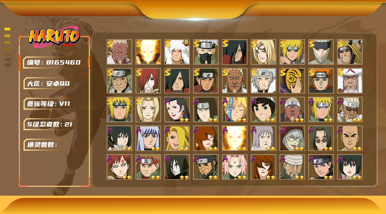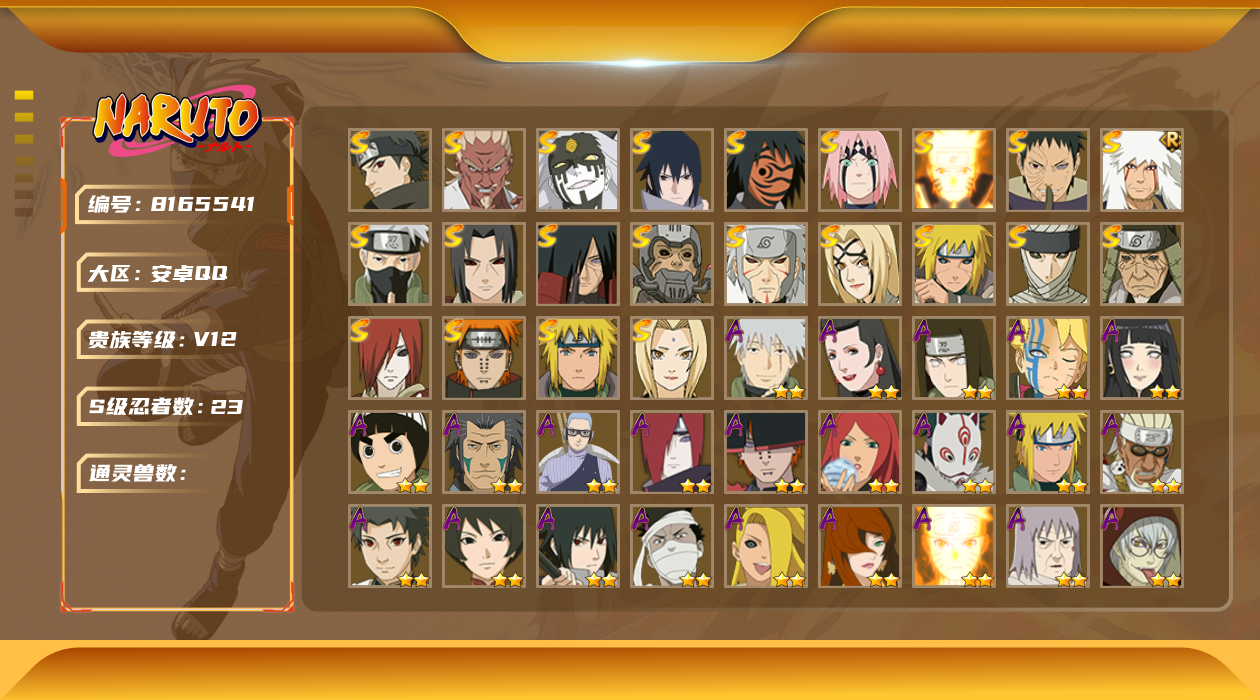 [8166115]x8741战斗力:1464w;段位:中忍3阶;本服排名:18;战区排名:未上榜;vip12级;s忍24个;a忍28个;通灵兽29个;s忍:大筒木桃式波风水门(普通)忍界大战大野木5星纲手(普通)仙人模式自来也须佐能乎宇智波止水自来也(普通)永恒万花筒宇智波佐助舞之豪杰自来也秽土转生三代目风影白面具宇智波斑4星猿飞日斩(普通)秽土转生长门九喇嘛连结漩涡鸣人红夜之刃神秘面具男忍界大战春野樱秽土转生千手扉间木叶创立千手柱间秽土转生解宇智波斑忍界大战艾博人传大筒木金式大蛇丸(普通)天道佩恩须佐能乎旗木卡卡西;a忍:5星迈特凯(普通)5星猿飞阿斯玛(普通)5星蝎(普通)5星干柿鬼鲛(普通)4星疾风传我爱罗3星死司凭血飞段忍者之路神秘面具男万花筒写轮眼宇智波佐助须佐能乎宇智波佐助忍界大战秋道丁次 忍界大战日向宁次忍界大战李洛克最终章日向雏田幻之真容旗木卡卡西新春限定宇智波止水新春限定波风水门青年波风水门近松十人卫千代五代目水影照美冥青年艾侠隐江湖纲手青年长门新春限定小南宇智波鼬(普通)迪达拉(普通)飞段(普通)桃式显现漩涡博人六代目水影长十郎;通灵兽:忍犬(普通)蓝蛇蛤蟆吉砂之守鹤忍龟镰鼬猿魔山椒鱼蜃鲛鲨蛤蟆仙人蛤蟆健蛞蝓(普通)乌鸦(普通)怒鬼爪熊猫怒鬼无臂万蛇(普通)蛤蟆龙蛞蝓侠隐江湖怒鬼(普通)螃蟹鵺蛤蟆广守鹤(普通)公牛辛牙梦貘鹰;时装:百战大蛇丸百战波风水门蜀面豪杰舞之豪杰自来也;详情看图【3046区】【安卓qq】【可二次实名】