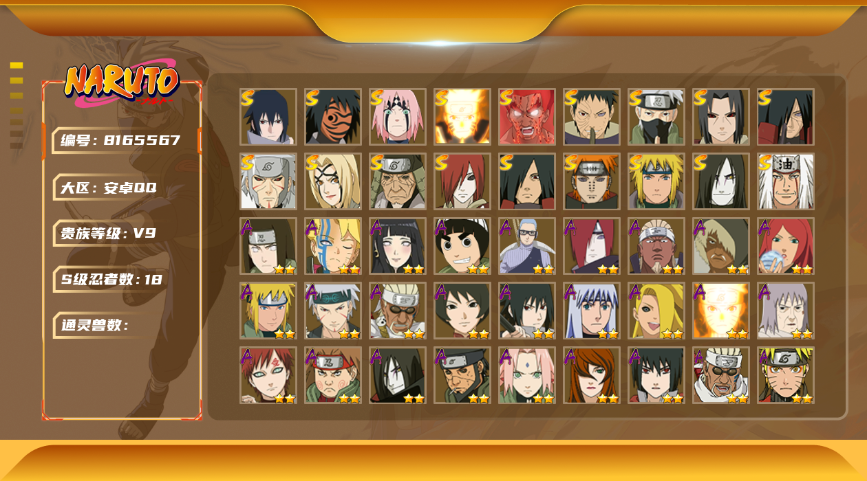 [8165567]x8896战斗力:1100w;段位:上忍2阶;本服排名:700;战区排名:未上榜;vip9级;s忍20个;a忍42个;通灵兽17个;s忍:大蛇丸(普通)秽土转生千手柱间秽土转生长门忍界大战宇智波带土宇智波斑(普通)秽土转生猿飞日斩自来也(普通)秽土转生解宇智波斑天道佩恩百豪纲手仙人模式药师兜九喇嘛连结漩涡鸣人波风水门(普通)死门迈特凯红夜之刃神秘面具男永恒万花筒宇智波佐助秽土转生宇智波鼬忍界大战春野樱须佐能乎旗木卡卡西秽土转生千手扉间;a忍:5星迈特凯(普通)5星猿飞阿斯玛(普通)5星蝎(普通)5星干柿鬼鲛(普通)4星疾风传我爱罗4星飞段(普通)4星死司凭血飞段仙人模式漩涡鸣人九尾查克拉漩涡鸣人万花筒写轮眼宇智波佐助须佐能乎宇智波佐助宇智波泉奈百豪春野樱忍界大战秋道丁次忍界大战日向宁次忍界大战李洛克最终章日向雏田秽土转生猿飞阿斯玛宇智波止水(普通)青年波风水门忍界大战我爱罗近松十人卫千代五代目水影照美冥奇拉比(普通)忍界大战奇拉比青年艾漂泊武士千手扉间不风青年长门小南(普通)地怨虞角都秽土转生角都晓大蛇丸宇智波鼬(普通)迪达拉(普通)秽土转生迪达拉漂泊浪客宇智波带土加藤断六代目水影长十郎五代目雷影达鲁伊桃式显现漩涡博人四代目土影黑土;通灵兽:忍犬(普通)蓝蛇蛤蟆吉忍龟镰鼬猿魔山椒鱼蜃鲛鲨蛤蟆仙人蛤蟆健乌鸦(普通)砂之守鹤蛤蟆龙蛤蟆广蛞蝓(普通)梦貘;时装:百战波风水门百战大蛇丸;详情看图【641区】【安卓qq】【可二次实名】