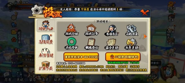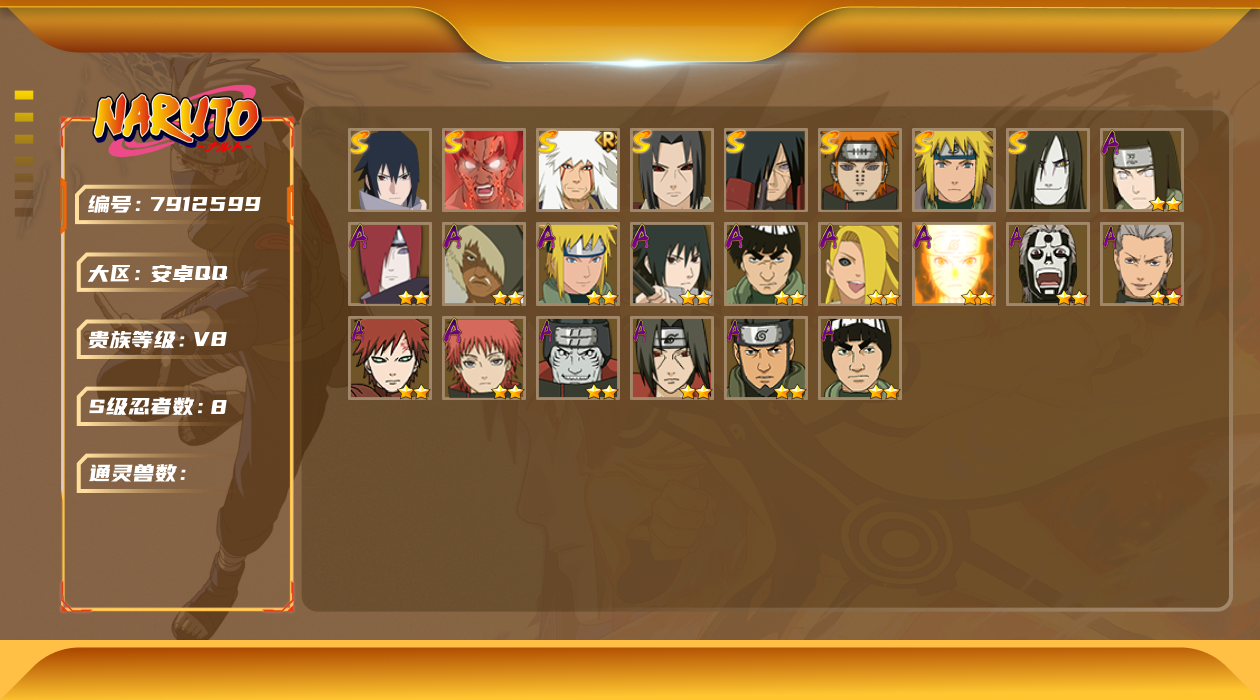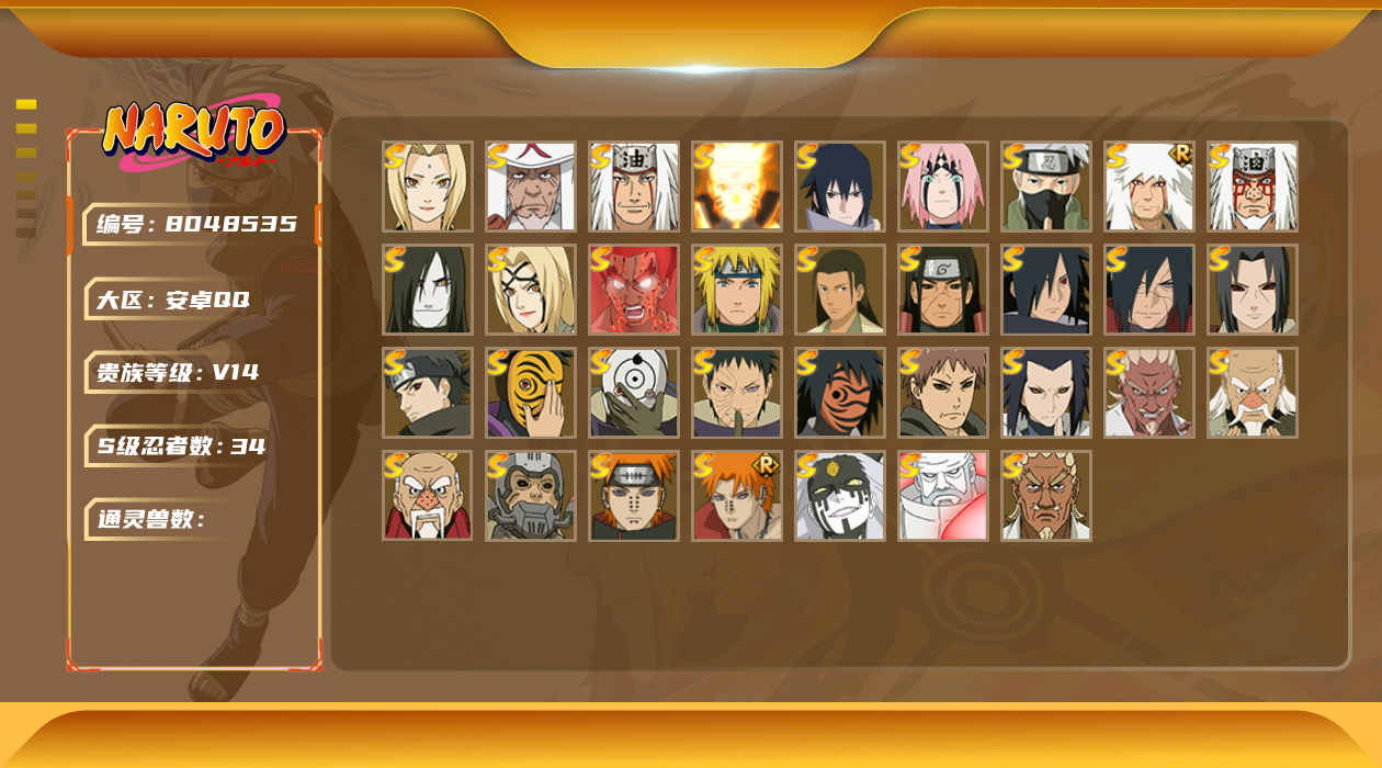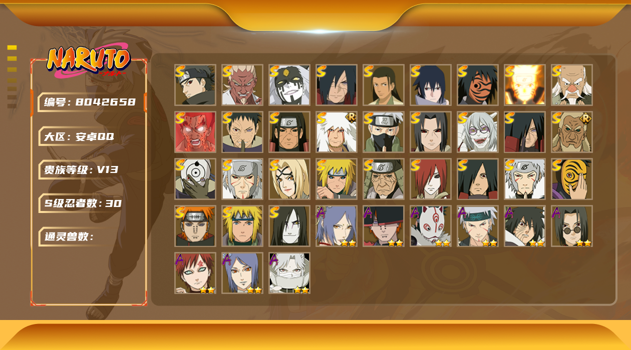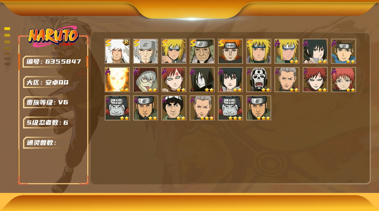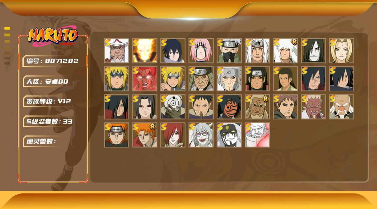 [6161094]实名: 可修改 贵族等级: v4 s忍数: 2 a忍数: 2 战力值万: 232882 s级忍者: 佩恩「天道」自来也 「舞之豪杰」 通灵兽: 忍犬忍龟蛤蟆吉蓝蛇镰鼬砂之守鹤