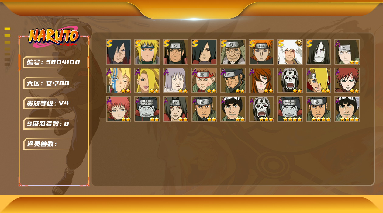 [5604108]实名: 可修改 贵族等级: v4 s忍数: 8 a忍数: 15 s级忍者: 千手柱间「秽土转生」猿飞日斩「秽土转生」宇智波斑佩恩「天道」大蛇丸波风水门自来也 「舞之豪杰」宇智波斑「秽土转生·解」 通灵兽: 忍犬忍龟蛤蟆吉蓝蛇猿魔蛤蟆仙人镰鼬山椒鱼蜃鲛鲨蛤蟆健乌鸦砂之守鹤
