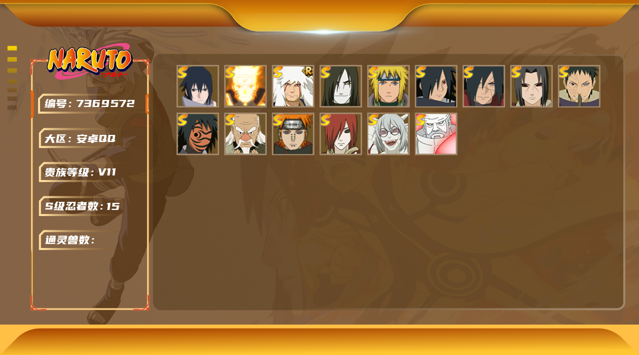 [7369572]v11 15s 可二次 可修改实名 s级忍者:宇智波斑「秽土转生·解」宇智波佐助「永恒万花筒」神秘面具男 「红夜之刃」大筒木金式「博人传」漩涡鸣人 「九喇嘛连结」大野木 「忍界大战」宇智波斑 「木叶创立」宇智波带土 「忍界大战」自来也 「舞之豪杰」宇智波鼬「秽土转生」药师兜「仙人模式」长门「秽土转生」佩恩「天道」波风水门大蛇丸