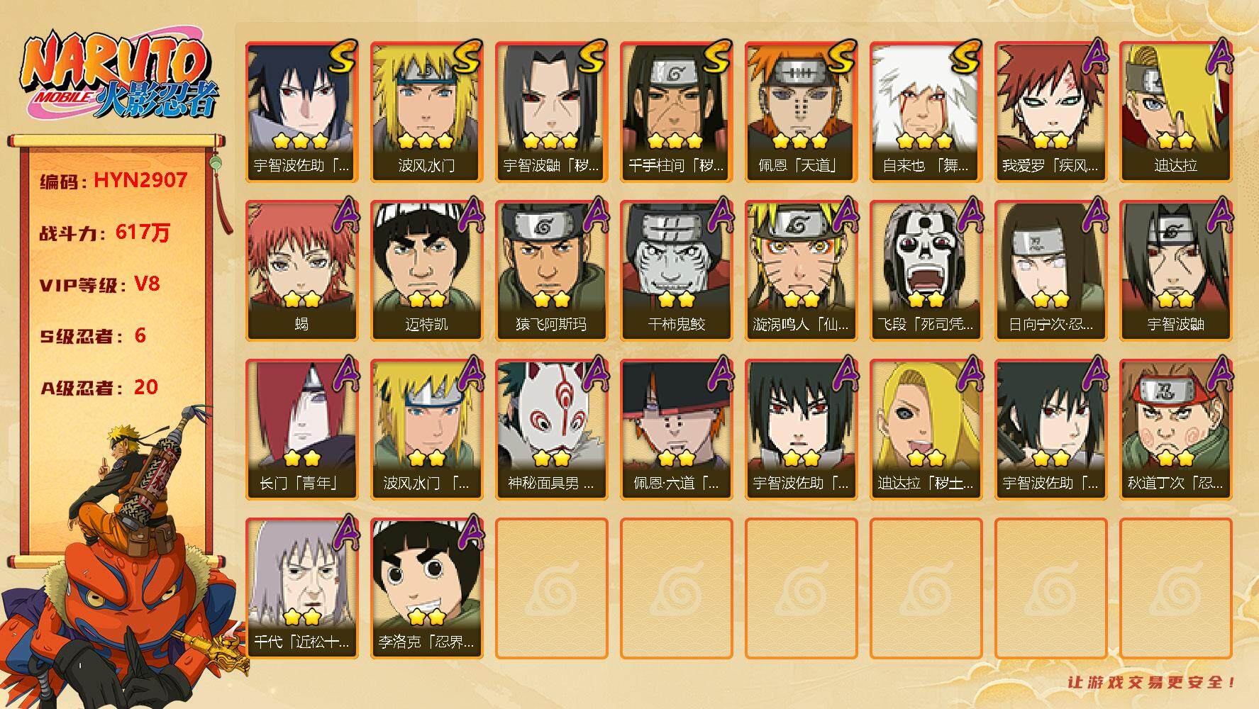 【hyn2907】v8/战力617w/s忍6/a忍20/2星我爱罗「疾风传」/蜃/2星飞段「死司凭血」/李洛克·截奉宗师-龙的传人/砂之守鹤/蓝蛇/2星神秘面具男「忍者之路」/宇智波鼬-编织虚实/蛞蝓/2星佩恩·六道「漂泊浪客」/2星迪达拉「秽土转生」/2星猿飞阿斯玛/镰鼬/2星宇智波佐助「万花筒写轮眼」/2星迪达拉/山椒鱼/波风水门-百战/蛤蟆仙人/2星日向宁次「忍界大战」/2星宇智波鼬/自来也·舞之豪杰-蜀面豪杰/3星宇智波佐助「永恒万花筒」/3星宇智波鼬「秽土转生」/2星迈特凯/2星长门「青年」/蛤蟆健/2星蝎/3星佩恩「天道」/3星波风水门/乌鸦/2星秋道丁次「忍界大战」/干柿鬼鲛-血雾怪人/3星千手柱间「秽土转生」/2星李洛克「忍界大战」/2星波风水门「青年」/3星自来也「舞之豪杰」/天天·峨眉宗师-熊猫少女/波风水门-传说的光芒/蛤蟆吉/2星漩涡鸣人「仙人模式」/忍犬/2星干柿鬼鲛/2星宇智波佐助「须佐能乎」/猿魔/黑土·博人转-烈土霓裳/蛤蟆龙/2星千代「近松十人卫」/鲛鲨/忍龟