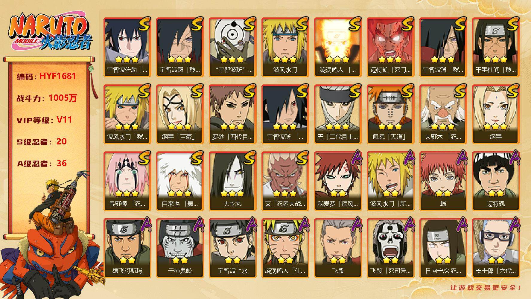 【hyf1681】v11/战力1005w/s忍20/a忍36/3星宇智波斑「秽土转生」/2星波风水门「新春限定」/3星纲手「百豪」/3星纲手/2星我爱罗「疾风传」/2星飞段「死司凭血」/3星无「二代目土影」/2星宇智波止水/2星宇智波鼬「新春限定」/2星奇拉比「忍界大战」/3星罗砂「四代目风影」/2星长十郎「六代目水影」/2星春野樱「百豪」/3星宇智波斑「白面具」/3星迈特凯「死门」/2星药师兜「半蛇斗篷」/2星迪达拉「秽土转生」/2星飞段/2星猿飞阿斯玛/3星春野樱「忍界大战」/2星宇智波佐助「万花筒写轮眼」/2星我爱罗「忍界大战」/2星漩涡鸣人「九尾查克拉」/2星日向宁次「忍界大战」/2星宇智波鼬/3星宇智波佐助「永恒万花筒」/2星迈特凯/2星长门「青年」/2星蝎/3星佩恩「天道」/2星桃地再不斩「漂泊武士」/3星波风水门/3星漩涡鸣人「九喇嘛连结」/3星波风水门「秽土转生」/2星秋道丁次「忍界大战」/2星漩涡博人「桃式显现」/3星千手柱间「秽土转生」/2星李洛克「忍界大战」/2星波风水门「青年」/3星自来也「舞之豪杰」/2星千手扉间「漂泊武士」/2星奇拉比/2星漩涡鸣人「仙人模式」/2星干柿鬼鲛/3星宇智波斑「木叶创立」/3星大蛇丸/3星艾「忍界大战」/3星宇智波斑「秽土转生·解」/2星艾「青年」/3星大野木「忍界大战」/2星宇智波佐助「须佐能乎」/2星千代「近松十人卫」