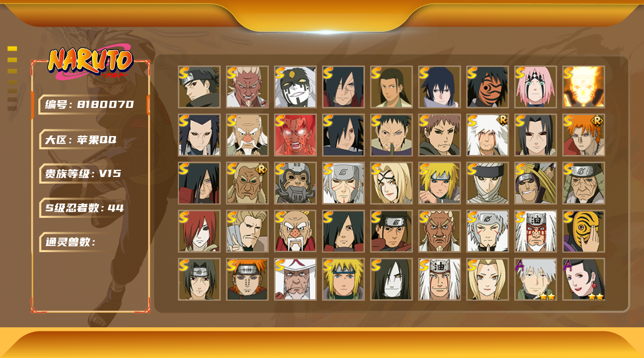[8180070]战斗力:3259w;段位:中忍2阶;本服排名16;vipip15级;总魅力值:20661;魅力等级:53;s忍47个;a忍78个,通灵兽42个,s忍:5星自来也(普通),5星仙人模式自来也,5星大蛇丸,5星纲手(普通),5星猿飞日斩(普通),5星须佐能乎宇智波鼬,4星百豪纲手,4星波风水门(普通),4星千手柱间(普通),4星二代目水影鬼灯幻月,4星忍界大战艾,4星三代目土影大野木,4星天道佩恩,九喇嘛连结漩涡鸣人,永恒万花筒宇智波佐助,忍界大战春野樱,舞之豪杰自来也,死门迈特凯,秽土转生波风水门,秽土转生猿飞日斩,千手扉间(普通),秽土转生千手扉间,秽土转生千手柱间,木叶创立千手柱间,宇智波斑(普通),秽土转生宇智波鼬,须佐能乎宇智波止水,秽土转生宇智波斑,木叶创立宇智波斑,秽土转生解宇智波斑,神秘面具男(普通),白面具宇智波斑,忍界大战宇智波带土,红夜之刃神秘面具男,四代目风影罗砂,秽土转生三代目风影,四代目雷影艾,三代目雷影艾,秽土转生金角银角,二代目土影无,秽土转生半藏,忍界大战大野木,超佩恩天道,秽土转生长门,仙人模式药师兜,大筒木桃式,博人传大筒木金式, ;a忍:5星迈特凯(普通),5星猿飞阿斯玛(普通),5星疾风传我爱罗,5星干柿鬼鲛(普通),5星飞段(普通),5星蝎(普通),5星死司凭血飞段,4星忍界大战秋道丁次,3星万花筒写轮眼宇智波佐助,3星忍界大战日向宁次,3星旗木卡卡西(普通),3星九尾查克拉漩涡鸣人,3星仙人模式漩涡鸣人,3星宇智波鼬(普通),3星木叶上忍猿飞木叶丸,3星忍界大战奇拉比,3星角都(普通),3星宇智波止水(普通),3星万花筒写轮眼旗木卡卡西,3星五代目水影照美冥,3星迪达拉(普通),3星秽土转生迪达拉,3星小南(普通),3星桃式显现漩涡博人,忍者之路神秘面具男,忍界大战天天,最终章日向雏田,须佐能乎宇智波佐助,忍界大战李洛克,忍界大战旗木卡卡西,百豪春野樱,幻之真容旗木卡卡西,疾风传咒印宇智波佐助,七夕限定猿飞阿斯玛,地陆,志村团藏,火影继承人猿飞日斩,忍界大战勘九郎,漂泊武士桃地再不斩,奇拉比(普通),青年艾,秽土转生猿飞阿斯玛,夏日泳装照美冥,桃地再不斩,忍界大战迈特凯,近松十人卫千代,达鲁伊(普通),新春限定宇智波止水,新春限定波风水门,青年波风水门,元气夏日旗木卡卡西,侠隐江湖照美冥,忍界大战我爱罗,青年三船,不风,青
