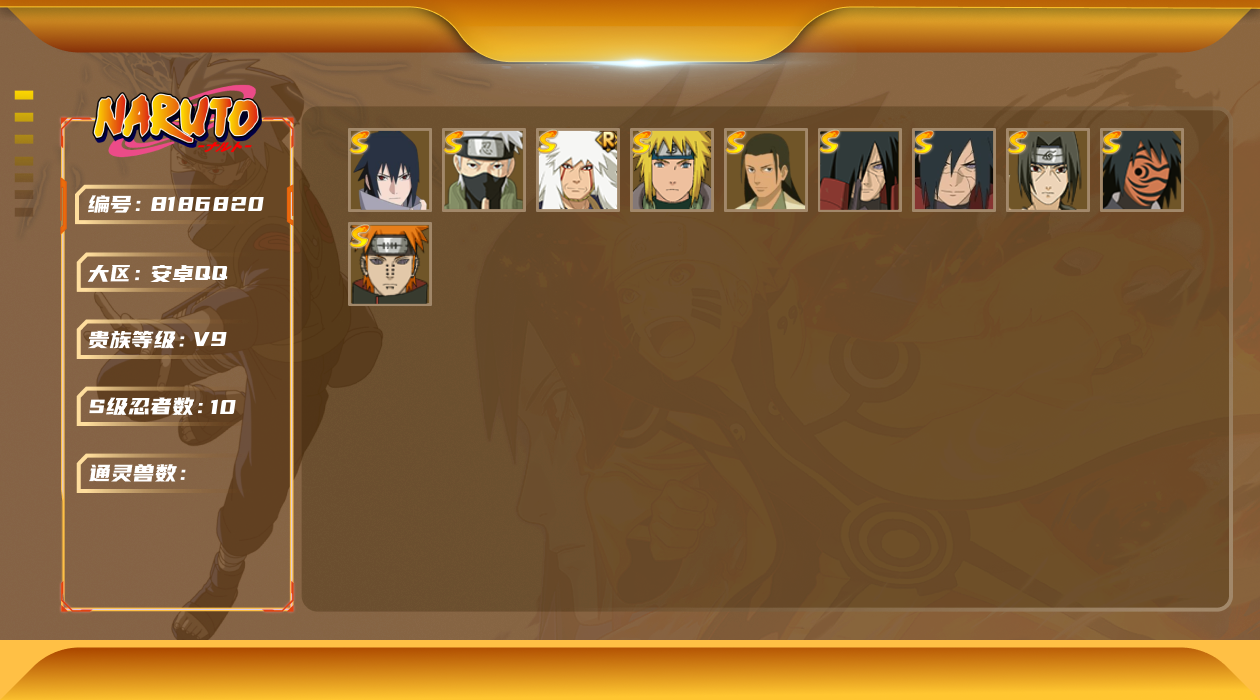 [8186820]v9 10s 可二次 s级忍者:宇智波斑「秽土转生·解」千手柱间·木叶创立宇智波佐助「永恒万花筒」神秘面具男 「红夜之刃」自来也 「舞之豪杰」旗木卡卡西「须佐能乎」宇智波斑「秽土转生」宇智波鼬 「须佐能乎」佩恩「天道」波风水门