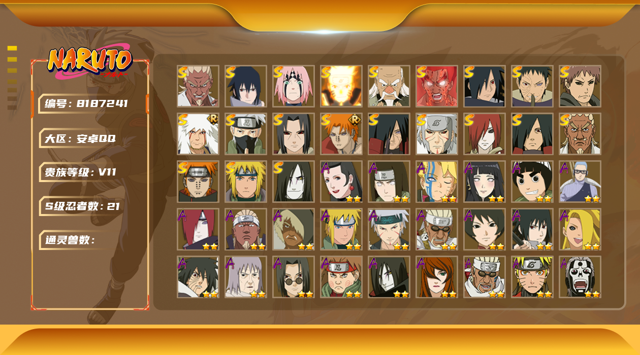 [8179595]x8681战斗力:900w;段位:上忍1阶;本服排名:1276;战区排名:未上榜;vip11级;s忍17个;a忍50个;通灵兽16个;s忍:秽土转生波风水门秽土转生宇智波斑忍界大战宇智波带土秽土转生千手扉间秽土转生宇智波鼬白面具宇智波斑百豪纲手大蛇丸(普通)死门迈特凯波风水门(普通)秽土转生长门忍界大战艾须佐能乎旗木卡卡西永恒万花筒宇智波佐助天道佩恩仙人模式药师兜忍界大战春野樱;a忍:5星迈特凯(普通)4星猿飞阿斯玛(普通)4星疾风传我爱罗4星干柿鬼鲛(普通)4星飞段(普通)仙人模式漩涡鸣人九尾查克拉漩涡鸣人万花筒写轮眼宇智波佐助须佐能乎宇智波佐助宇智波泉奈百豪春野樱忍界大战秋道丁次 忍界大战李洛克幻之真容旗木卡卡西万花筒写轮眼旗木卡卡西忍界大战旗木卡卡西宇智波止水(普通)新春限定宇智波止水新春限定波风水门青年波风水门新春限定我爱罗忍界大战我爱罗近松十人卫千代五代目水影照美冥漂泊武士桃地再不斩忍界大战奇拉比奇拉比(普通)青年艾半蛇斗篷药师兜不缘青年长门漂泊浪客佩恩六道新春限定小南角都(普通)地怨虞角都秽土转生角都晓大蛇丸绯流琥蝎蝎(普通)宇智波鼬(普通)新春限定宇智波鼬迪达拉(普通)秽土转生迪达拉死司凭血飞段暴怒宇智波带土木叶上忍猿飞木叶丸桃式显现漩涡博人六代目水影长十郎五代目雷影达鲁伊四代目土影黑土;通灵兽:忍犬(普通)蓝蛇蛤蟆吉忍龟镰鼬猿魔山椒鱼蜃鲛鲨蛤蟆仙人蛤蟆健乌鸦(普通)蛞蝓(普通)砂之守鹤蛤蟆龙蛤蟆广;时装:百战大蛇丸百战波风水门;详情看图【873区】【安卓qq】【可二次实名】