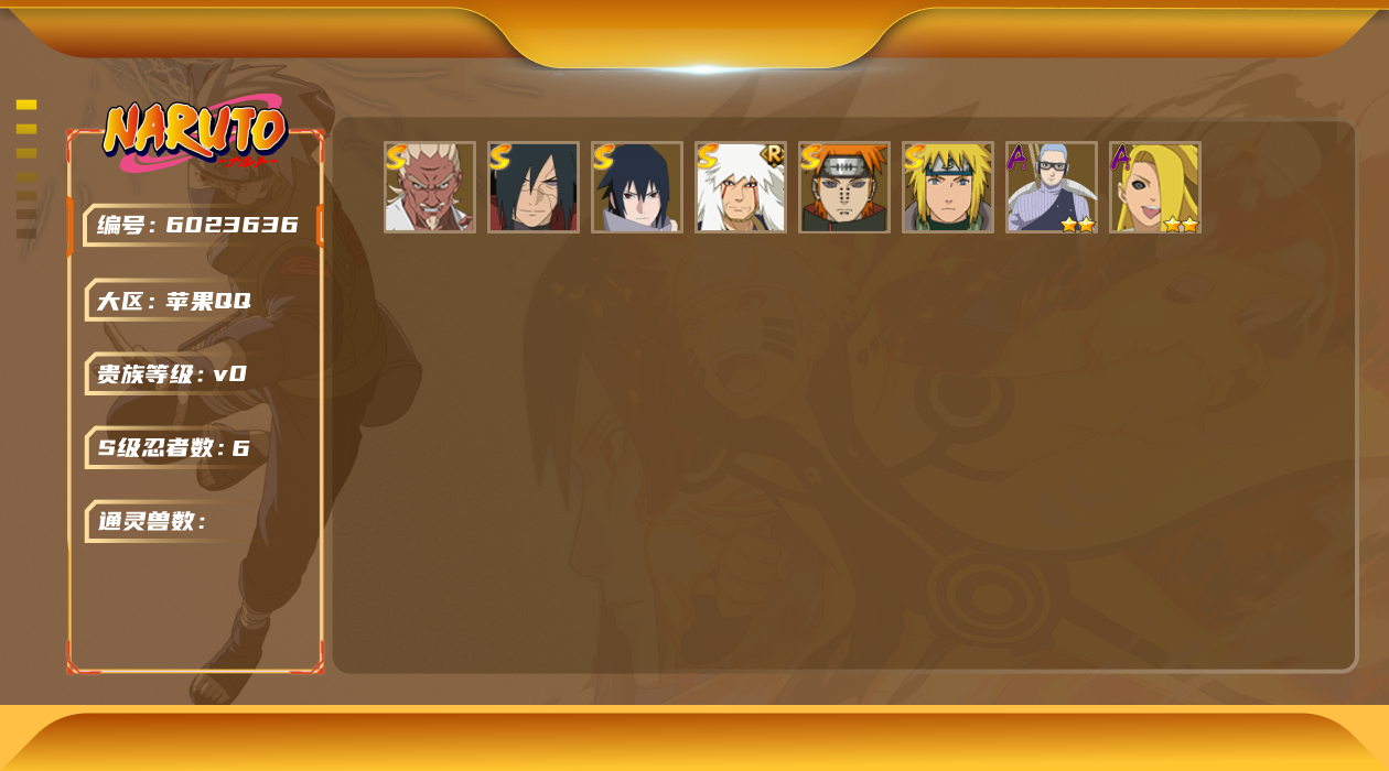 [6025120]实名: 可修改 贵族等级: v10 s忍数: 10 a忍数: 28 s级忍者: 宇智波鼬「秽土转生」药师兜「仙人模式」宇智波斑「秽土转生」佩恩「天道」大蛇丸波风水门宇智波带土 「忍界大战」自来也 「舞之豪杰」漩涡鸣人 「九喇嘛连结」宇智波佐助「永恒万花筒」 通灵兽: 忍犬忍龟蛤蟆吉蓝蛇猿魔蛞蝓蛤蟆仙人镰鼬山椒鱼蜃鲛鲨蛤蟆健乌鸦蛤蟆龙熊猫砂之守鹤
