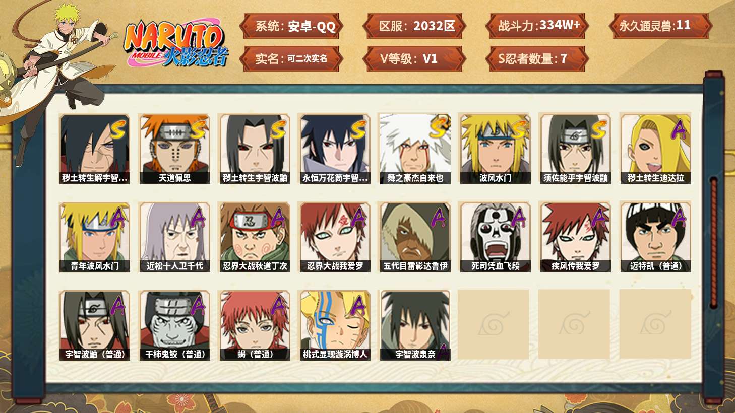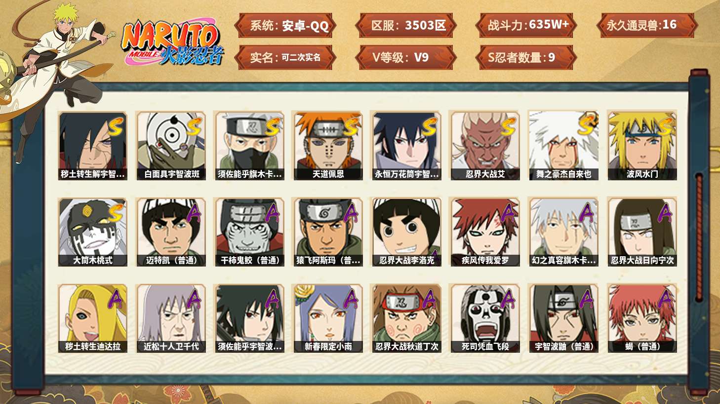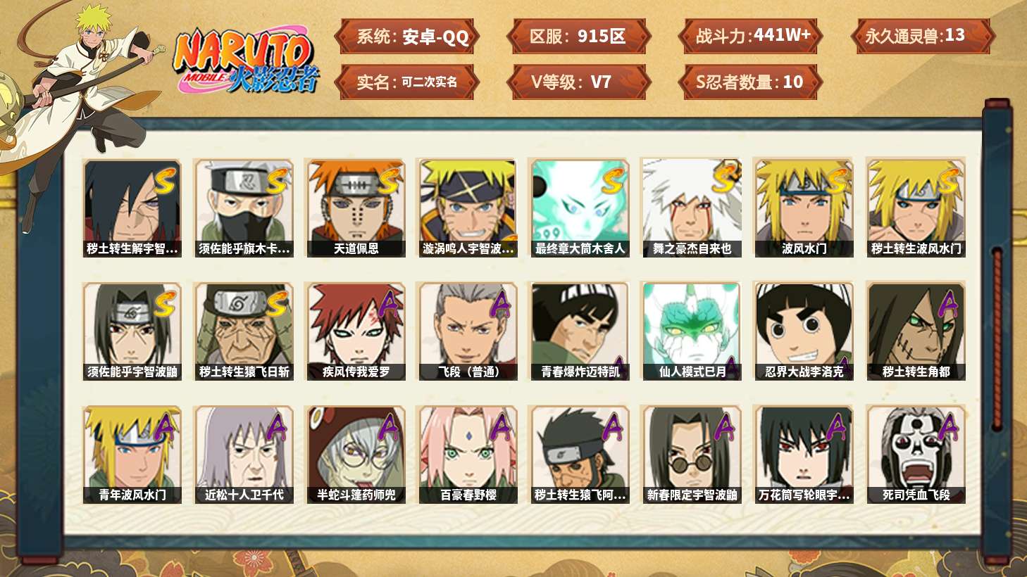 【s忍者12 a忍者36 通灵15】【安卓q-2418区-143级-v10-601万战力】【s级】宇智波带土「忍界大战」 漩涡鸣人「九喇嘛连结」 波风水门「秽土转生」 佩恩「天道」 漩涡鸣人·宇智波佐助 自来也「舞之豪杰」 波风水门 神秘面具男 宇智波斑「秽土转生·解」 大蛇丸 宇智波佐助「永恒万花筒」 宇智波鼬「须佐能乎」【a级】神秘面具男「忍者之路」 迈特凯「青春爆炸」 药