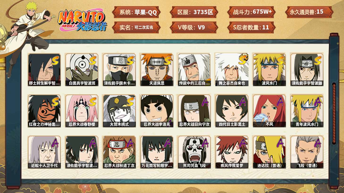 【s忍者11 a忍者27 通灵15】【苹果q-3634区-136级-v7-441万战力】【s级】宇智波鼬「须佐能乎」 波风水门 自来也「传说中的三忍」 千手柱间「木叶创立」 宇智波带土「忍界大战」 宇智波斑「秽土转生·解」 宇智波佐助「永恒万花筒」 自来也「舞之豪杰」 佩恩「天道」 波风水门「九喇嘛连结」 漩涡鸣人·宇智波佐助【a级】秋道丁次「忍界大战」 旗木卡卡西「幻之真容」