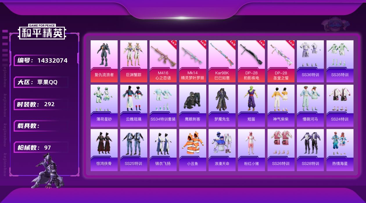 [14332074]实名: 可修改 时装数: 292 呛械数: 97 战备数: 59 热门装扮: 梦魇先生鹰眼刺客复仇流浪者巨渊蟹踪 稀有呛皮: m416心之恋语dp-28圣堂之誓mk14精灵梦叶罗丽kar98k-巳巳如意dp-28-豹影疾电