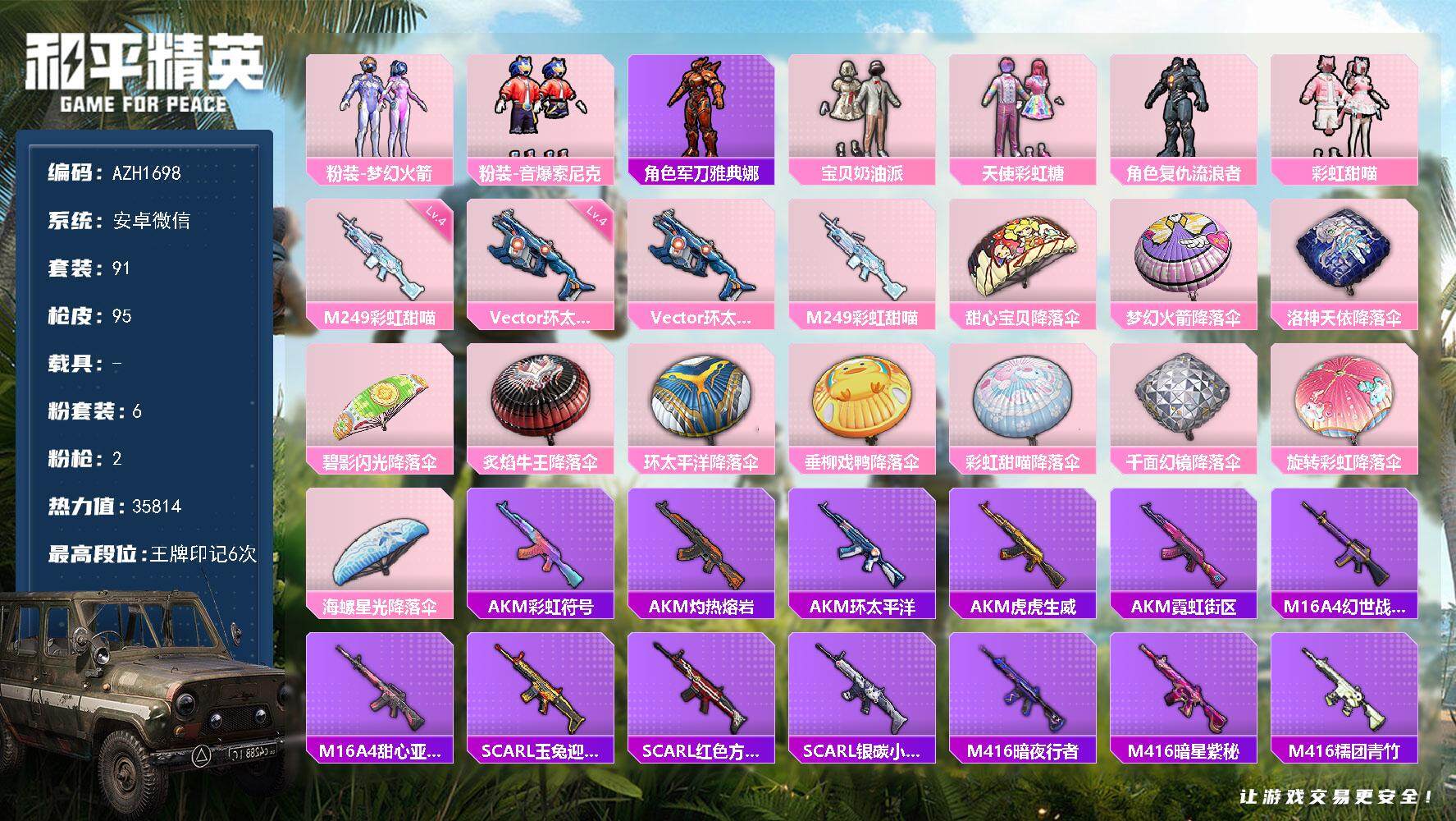 安卓 微信【梦幻火箭 四级环太平洋vect四级彩虹甜喵m249】6粉装-2特效呛-0载具-0粉色飞行器-35814热力值-6王牌印记-91套装-95呛皮 【热门品类】:粉装-梦幻火箭,粉装-音爆索尼克,角色-军刀雅典娜 【粉色套装】:粉装-宝贝奶油派,粉装-天使彩虹糖,粉装-梦幻火箭,角色-复仇流浪者,粉装-彩虹甜喵,粉装-音爆索尼克 【粉色呛皮等级】:vect-环太平洋四级,m2