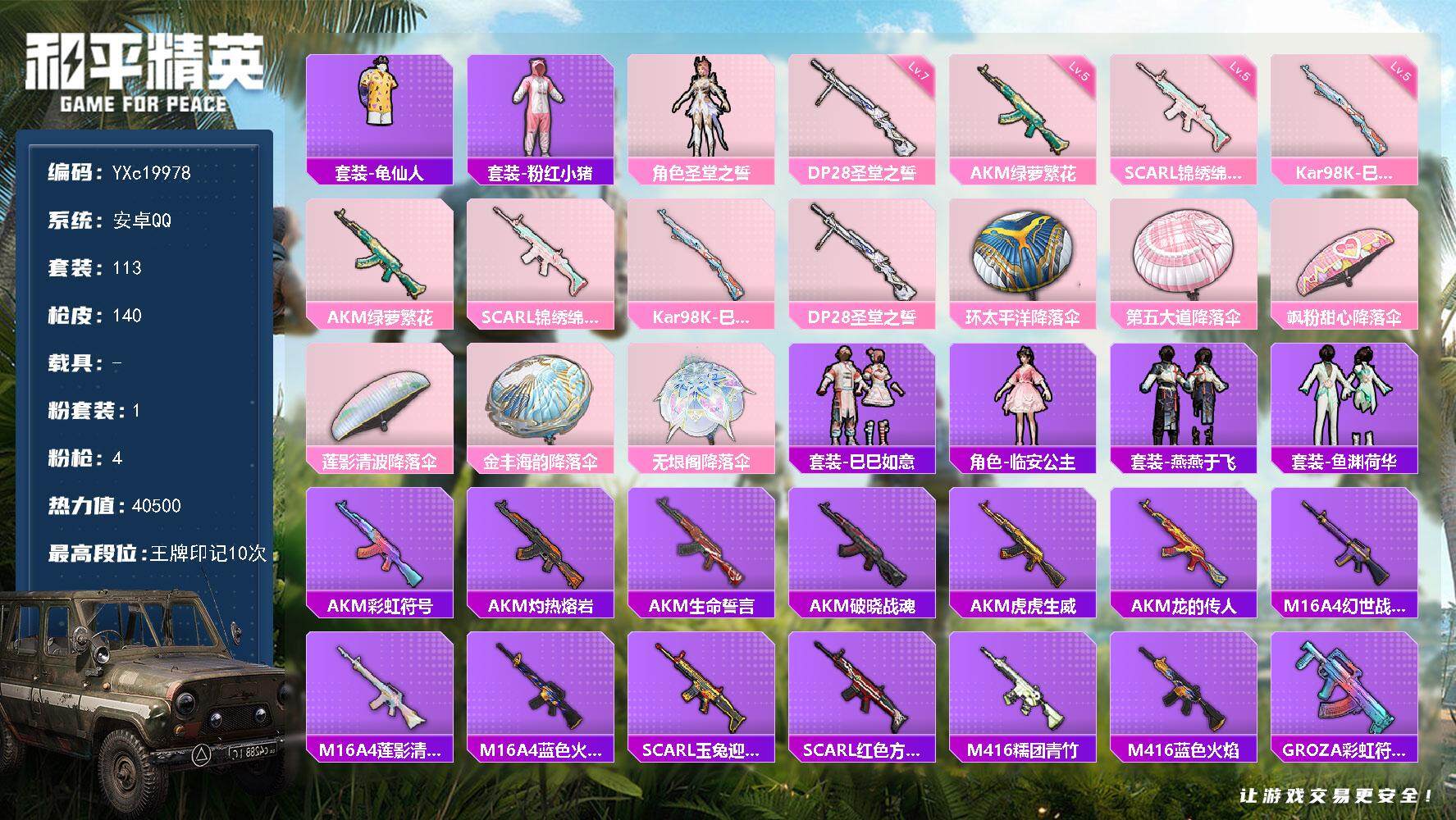 【2粉5特 沙漠守护者黑丝 蓝螳螂 螃蟹头】安卓q-1稀有2粉装5特效呛6热门128套装160呛皮 47578热力值 5印记 历史超级王牌3星【1稀有】 akm-缤纷海域【2粉装】 异瞳寒姬 冷漠罗丽【5特效呛】 p90-冷漠罗丽 7级 kar98k-巳巳如意 5级 dp-28-豹影疾电 5级 aug-暖羊咩咩 5级 groza-镜光银凌 5级【6热门】 m