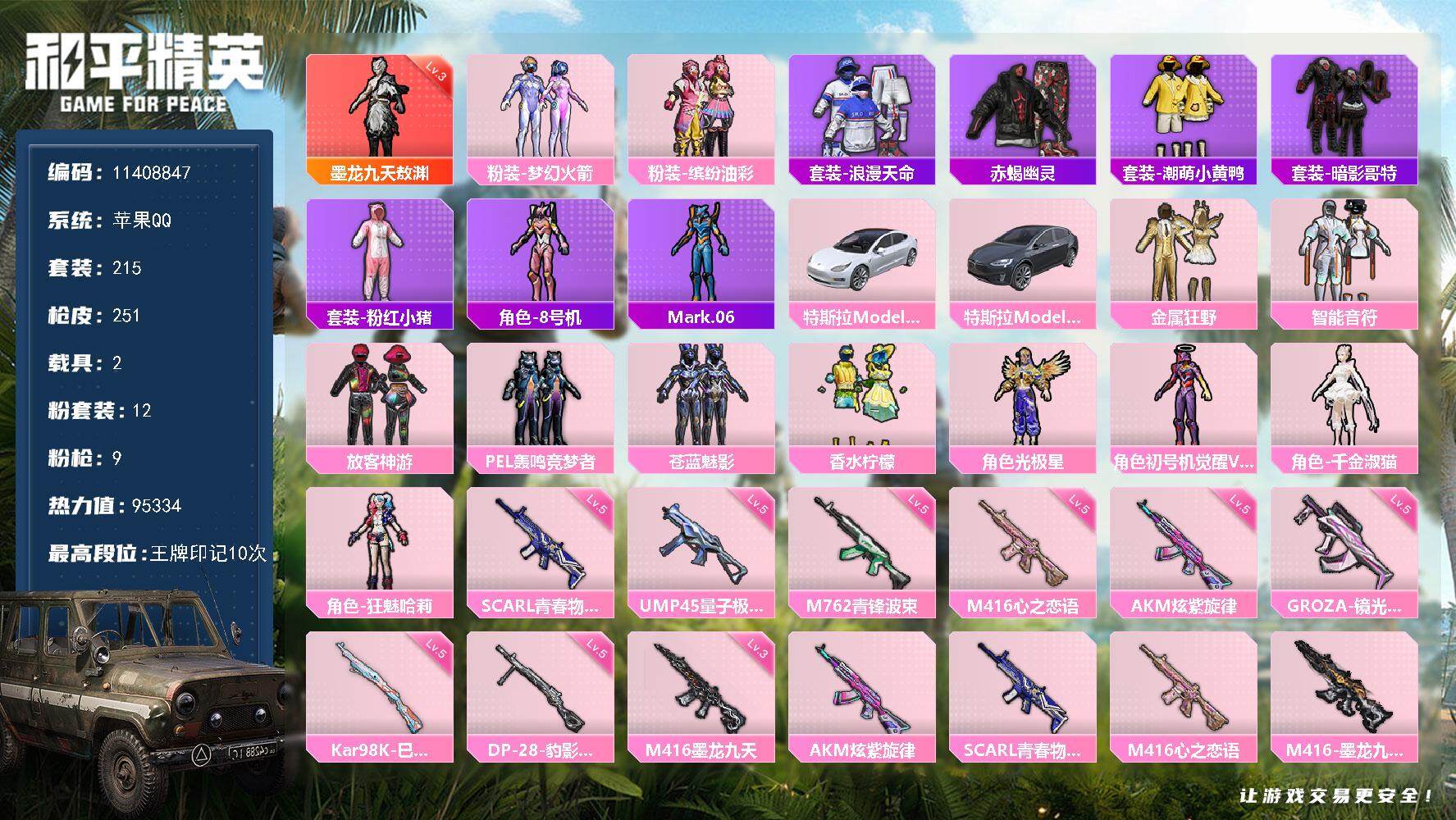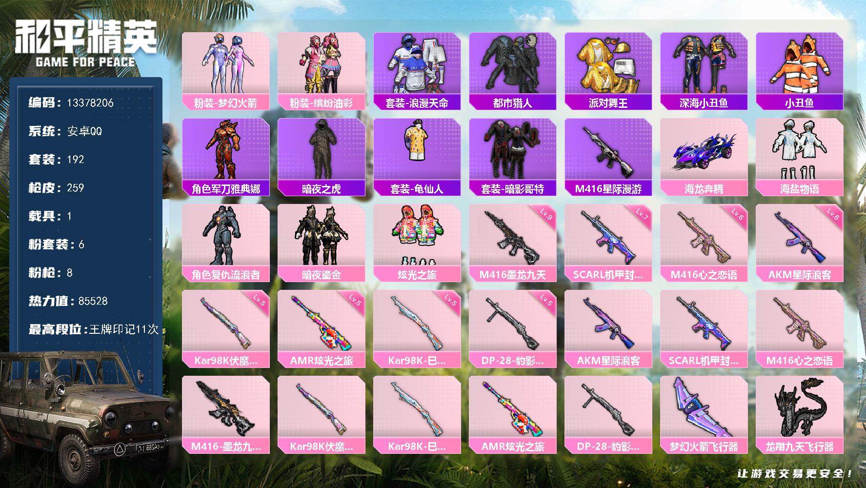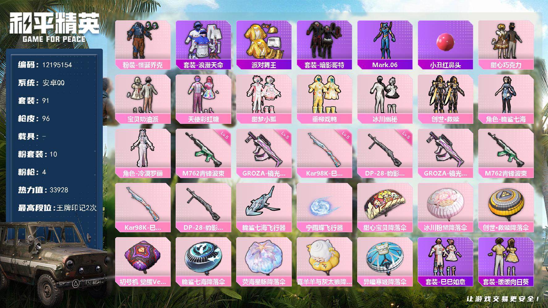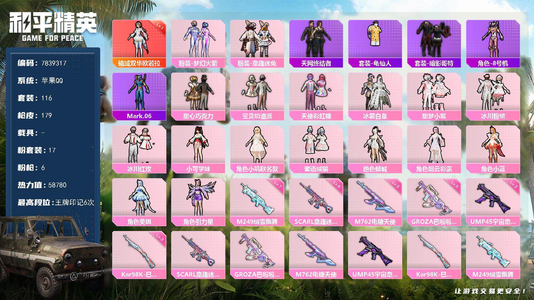 _2287978-可二次安卓q-2稀有1载具22粉装6特效呛34热门242套装260呛皮96500热力值精品女号1408点券198物资币100多天精英特权卡巧克力三姐妹小蓝童趣迷兔蜜语绒猫旋转彩虹彩虹鹿灵蓝莓炮弹山涧鹿灵和服胖达浪漫波比仓鼠灰灰糯粉咩咩兔兔白日梦激萌罗小黑动感兔斯基萌熊伴侣青涩年华粉熊包灰熊包童趣迷兔头盔四级包伙伴嘟嘟满级m416心之恋语满级狗砸旋转彩虹满级ump45恐龙拽拽15印记历史超级王牌9星【2稀有】akm-缤纷海域浪漫天命【1载具】兰博轿车灰色【22粉装】小蓝萨利娅时空协奏·心弦蜜语绒猫宝贝奶油派天使彩虹糖甜心巧克力飒粉甜心酣梦娃娃花间之火童趣迷兔冰霜白皇炙焰红王冰川红玫旋转彩虹银龙傲海暗夜玫瑰林间仙鹿山涧鹿灵彩虹鹿灵俏雪含霜蓝莓炮弹【6特效呛】m416-心之恋语7级kar98k-巳巳如意5级aug-暖羊咩咩5级slr-暗夜玫瑰4级groza-旋转彩虹7级ump45-恐龙拽拽7级【34热门】龟仙人青涩年华仓鼠灰灰动感兔斯基爱崽白熊鹰眼刺客软萌银虎兔兔白日梦激萌罗小黑迅捷狂鲨深海小丑鱼浪漫波比胖达圆圆胖达团团暗夜契约暗影哥特团圆交子瑞龙福将纯白誓言豚鼠丹丹萌熊伴侣狂沙舞者漫步者抹茶蜜豆破蛋小黄鸡极速红龙弄潮海豚m416-仓鼠灰灰m762-瑞龙福将m24-奇异狩猎者mk47-林间仙鹿mini14-林间仙鹿汤姆逊-林间仙鹿groza-林间仙鹿【4飞行器】春暖花开飞行器深海曼妙飞行器幻海精灵飞行器天之羽翼飞行器【4头盔】甜心宝贝头盔深海小丑鱼头盔花间之火头盔夏日绵绵冰头盔【5背包】梦幻火箭背包甜心宝贝背包萌熊伴侣背包深海小丑鱼背包夏日绵绵冰背包营地id:767718100
