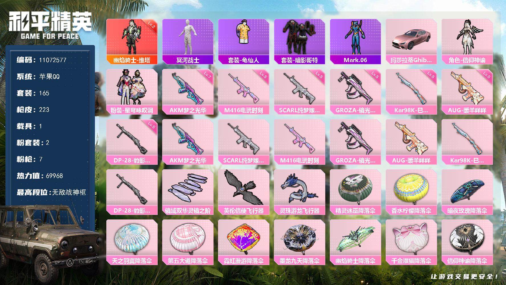 _2287983-可二次苹果q-69968热力值22王牌印记历史无敌战神【微氪小极品高印记无敌战神框(ss33赛季)红装-维塔2级木乃伊老6服红眼罩蓝螳螂小鸟芋圆】165套装223呛皮【1载具】玛莎拉蒂粉色【1神装】幽焰骑士-维塔2级【1稀有】木乃伊【2粉装】星穹咏叹调信仰神谕【7特效呛】scar-l-纯梦嫁纱5级m416-电玩时刻5级kar98k-巳巳如意5级dp-28-豹影疾电5级aug-暖羊咩咩5级groza-镜光银凌5级akm-梦之光华7级【15热门】mark.06龟仙人雪山精英鹰眼刺客蔷薇魔法师奇迹天团暗影哥特团圆交子瑞龙福将粉甜马卡龙破蛋小黄鸡黑色刀锋弄潮海豚m762-瑞龙福将m24-奇异狩猎者【2头盔】金风玉露头盔马卡龙头盔【1背包】深海小丑鱼背包营地id:704085191