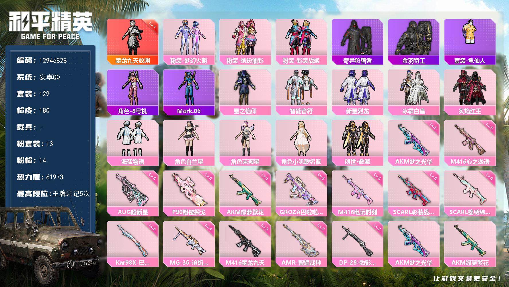 _2287962-可二次安卓q-1红装1稀有13粉装14特效呛10热门129套装1级敖渊梦幻火箭猪妹小白龙奇异狩猎者金羽特工蓝螳螂粉螳螂nv战队服青蛙服m4墨龙九天m4心之恋语ak梦之光华aug超新星180呛皮61973热力值5印记历史超级王牌9星【1红装】墨龙九天-敖渊1级【1稀有】奇异狩猎者【13粉装】梦幻火箭白兰星茉莉星小叽联名款创世救赎彩装战姬智能音符缤纷油彩星之信仰新星烈龙冰霜白皇炙焰红王海盐物语【14特效呛】scar-l-锦绣绵绵5级m416-心之恋语5级m416-墨龙九天3级m416-电玩时刻5级akm-绿萝繁花5级kar98k-巳巳如意5级mg-36-沧焰双生4级dp-28-豹影疾电2级aug-超新星5级amr-智耀战神2级groza-巴啦啦小魔仙5级akm-梦之光华5级p90-粉樱探戈5级scar-l-彩装战姬5级【10热门】8号机mark.06龟仙人鹰眼刺客金羽特工nv战队服漫步者冰爽海盐破蛋小黄鸡m762-奇异狩猎者【4飞行器】龙翔九天飞行器花傲天飞行器镜光幻境飞行翼炎氏战神飞行翼【1头盔】梦幻火箭头盔【1背包】梦幻火箭背包营地id:526761047