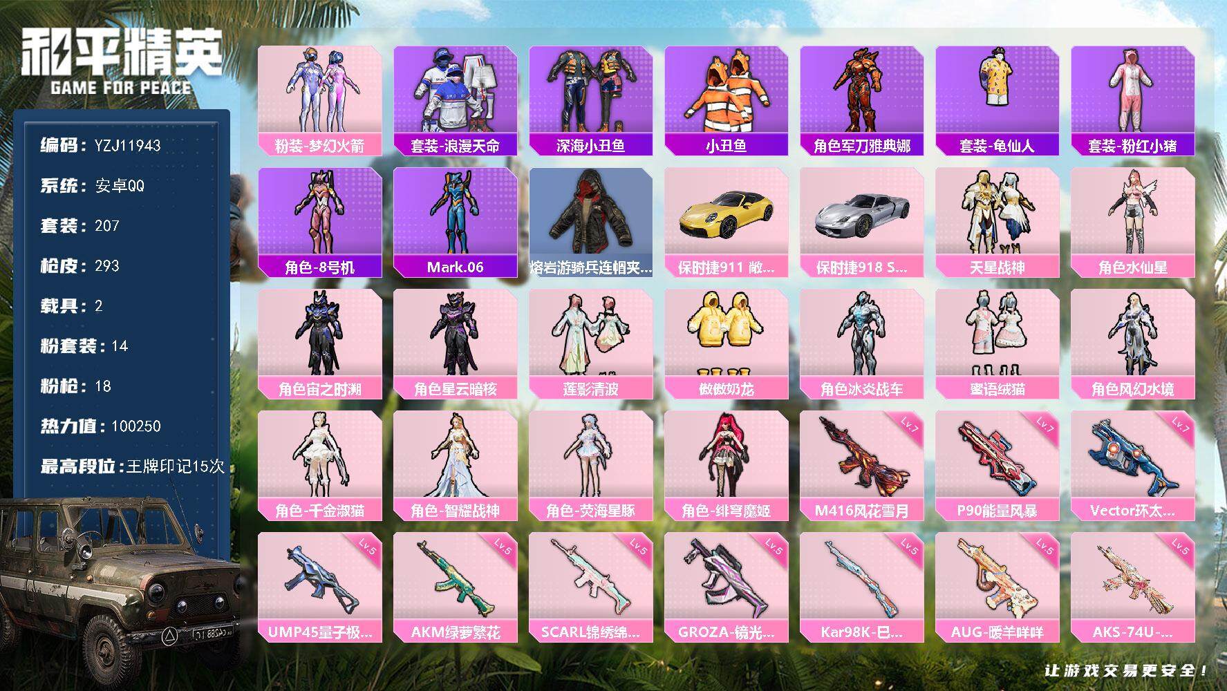 _2287990-可二次-安卓q-满级m4女娲灵识奇异狩猎者浪漫天命红眼罩三款战斗服情公主桃粉嫣然阿尔茜蜜桃特工蝶舞蔷薇显圣真君俏雪含霜吟月归客迪迦奥特曼捷德奥特曼艾克斯奥特曼蓝冰羽雪兔飞飞粉红小猪冰川特警身法面罩(西部牛仔面罩)-59029热力值5王牌印记历史超级王牌5星163套装155呛皮【3载具】玛莎拉蒂蓝色焰龙咆哮萌喵橘座【2稀有】奇异狩猎者浪漫天命【9粉装】桃粉嫣然阿尔茜蜜桃特工蝶舞蔷薇显圣真君俏雪含霜吟月归客复仇流浪者海渊国主【4特效呛】m416-女娲灵识9级kar98k-巳巳如意5级m200-伏羲圣卦2级scar-l-青春物语4级【18热门】梦魇先生鹰眼刺客金羽特工暗影哥特迪迦奥特曼醒狮腾龙团圆交子瑞龙福将粉红小猪豚鼠丹丹西部牛仔狂沙舞者漫步者海洋之心破蛋小黄鸡极速红龙英勇保护者m762-瑞龙福将【1头盔】心之恋语头盔【1背包】深海小丑鱼背包营地id:794696274
