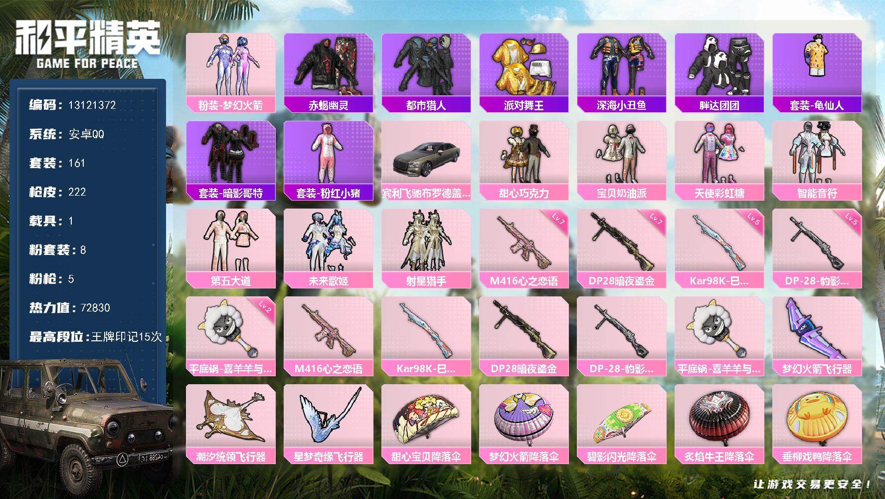 _2287987-可二次-安卓q-6稀有1载具8粉装5特效呛14热门161套装222呛皮72830热力值15印记6卓越1传奇历史卓越王牌14星极品身法素材号梦幻火箭三姐妹都市赤蝎金鞋未来歌姬第五大道满级心之恋语胖达tt战队服红眼罩海盐绵绵冰【6稀有】赤蝎幽灵awm-黄金龙骨akm-缤纷海域都市猎人派对舞王派对舞王(金靴子)【1载具】宾利飞驰布罗德盖棕双色【8粉装】梦幻火箭宝贝奶油派天使彩虹糖甜心巧克力未来歌姬射星猎手智能音符第五大道【5特效呛】m416-心之恋语7级kar98k-巳巳如意5级dp-28-豹影疾电5级dp-28-暗夜鎏金7级平底锅-喜羊羊与灰太狼2级【14热门】龟仙人浪漫假日呆萌铁蟹鹰眼刺客深海小丑鱼胖达团团tt战队服暗影哥特纯白誓言粉红小猪漫步者弄潮海豚m762-奇异狩猎者s686-奇异狩猎者【2飞行器】梦幻火箭飞行器潮汐统领飞行器【4头盔】梦幻火箭头盔甜心宝贝头盔深海小丑鱼头盔心之恋语头盔【4背包】梦幻火箭背包甜心宝贝背包古堡领主背包夏日绵绵冰背包营地id:729311682