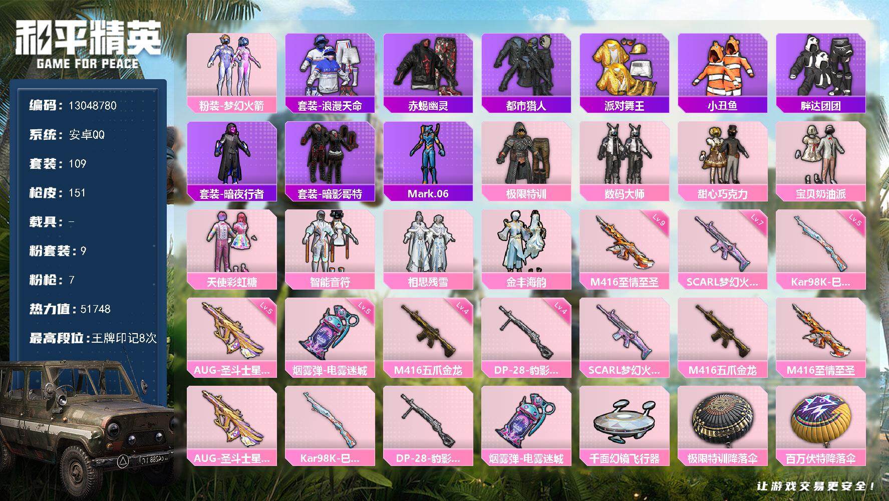 _2287984-可二次-安卓q-6稀有9粉装7特效呛10热门109套装151呛皮51748热力值8印记1卓越1传奇1绝世历史绝世王牌21星极品身法素材号梦幻火箭巧克力三姐妹都市赤蝎金鞋满级至情至圣满级斯嘎梦幻火箭蓝螳螂暗夜行者胖达身法鲨鱼裤红眼罩【6稀有】赤蝎幽灵akm-缤纷海域都市猎人浪漫天命派对舞王派对舞王(金靴子)【9粉装】梦幻火箭宝贝奶油派天使彩虹糖甜心巧克力金丰海韵智能音符数码大师极限特训相思残雪【7特效呛】scar-l-梦幻火箭7级m416-五爪金龙4级kar98k-巳巳如意5级dp-28-豹影疾电4级aug-圣斗士星矢5级m416-至情至圣9级盐雾蛋-电雾迷城5级【10热门】mark.06小丑鱼鹰眼刺客暗夜行者迅捷狂鲨胖达团团暗影哥特水银刺客漫步者弄潮海豚【1飞行器】千面幻镜飞行器【4头盔】梦幻火箭头盔甜心宝贝头盔百万伏特头盔深海小丑鱼头盔【5背包】梦幻火箭背包甜心宝贝背包百万伏特背包萌熊伴侣背包深海小丑鱼背包营地id:760971307