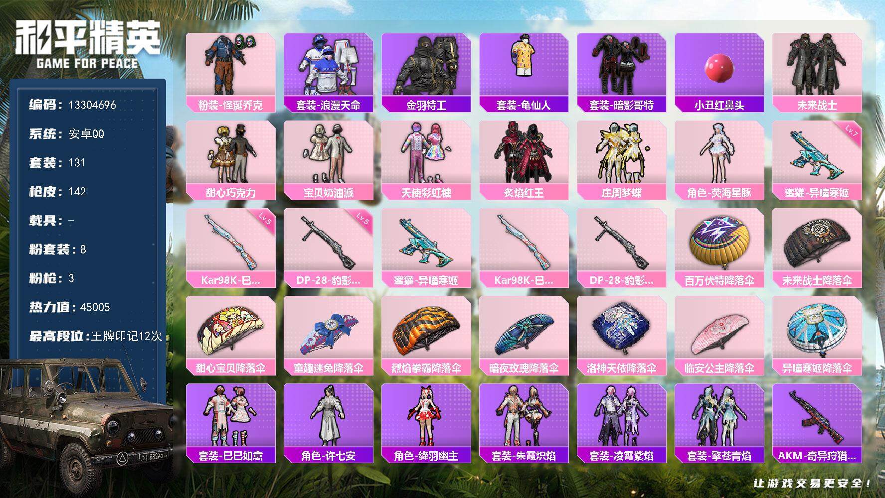 _2287978-可二次安卓q-2稀有1载具22粉装6特效呛34热门242套装260呛皮96500热力值精品女号1408点券198物资币100多天精英特权卡巧克力三姐妹小蓝童趣迷兔蜜语绒猫旋转彩虹彩虹鹿灵蓝莓炮弹山涧鹿灵和服胖达浪漫波比仓鼠灰灰糯粉咩咩兔兔白日梦激萌罗小黑动感兔斯基萌熊伴侣青涩年华粉熊包灰熊包童趣迷兔头盔四级包伙伴嘟嘟满级m416心之恋语满级狗砸旋转彩虹满级ump45恐龙拽拽15印记历史超级王牌9星【2稀有】akm-缤纷海域浪漫天命【1载具】兰博轿车灰色【22粉装】小蓝萨利娅时空协奏·心弦蜜语绒猫宝贝奶油派天使彩虹糖甜心巧克力飒粉甜心酣梦娃娃花间之火童趣迷兔冰霜白皇炙焰红王冰川红玫旋转彩虹银龙傲海暗夜玫瑰林间仙鹿山涧鹿灵彩虹鹿灵俏雪含霜蓝莓炮弹【6特效呛】m416-心之恋语7级kar98k-巳巳如意5级aug-暖羊咩咩5级slr-暗夜玫瑰4级groza-旋转彩虹7级ump45-恐龙拽拽7级【34热门】龟仙人青涩年华仓鼠灰灰动感兔斯基爱崽白熊鹰眼刺客软萌银虎兔兔白日梦激萌罗小黑迅捷狂鲨深海小丑鱼浪漫波比胖达圆圆胖达团团暗夜契约暗影哥特团圆交子瑞龙福将纯白誓言豚鼠丹丹萌熊伴侣狂沙舞者漫步者抹茶蜜豆破蛋小黄鸡极速红龙弄潮海豚m416-仓鼠灰灰m762-瑞龙福将m24-奇异狩猎者mk47-林间仙鹿mini14-林间仙鹿汤姆逊-林间仙鹿groza-林间仙鹿【4飞行器】春暖花开飞行器深海曼妙飞行器幻海精灵飞行器天之羽翼飞行器【4头盔】甜心宝贝头盔深海小丑鱼头盔花间之火头盔夏日绵绵冰头盔【5背包】梦幻火箭背包甜心宝贝背包萌熊伴侣背包深海小丑鱼背包夏日绵绵冰背包营地id:767718100