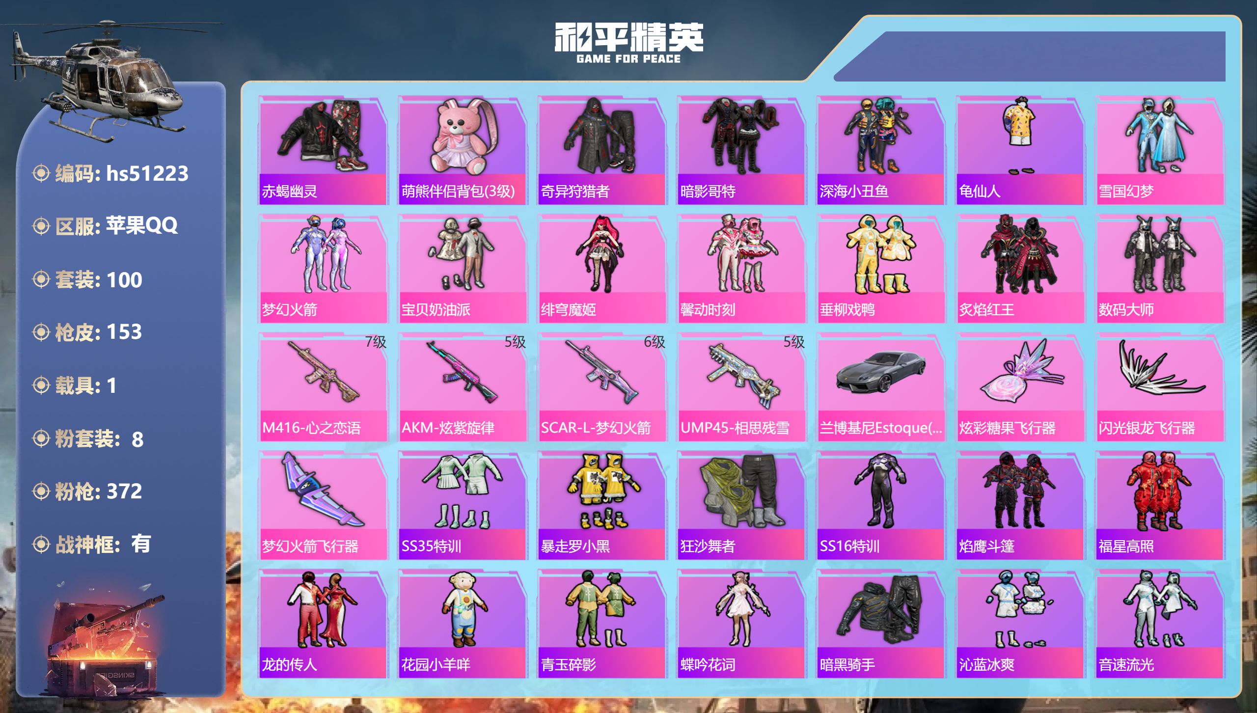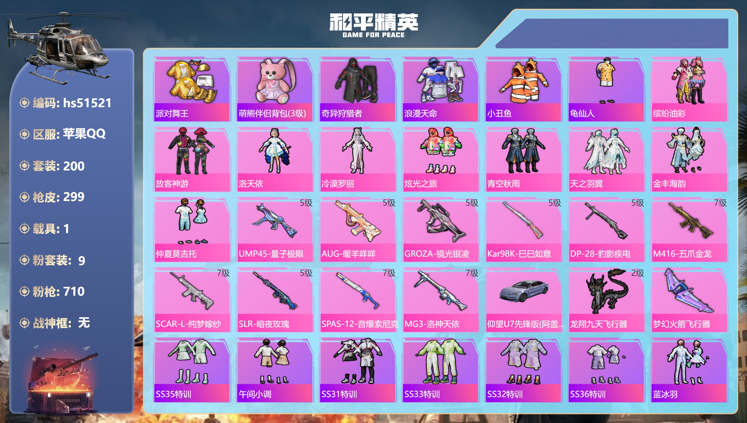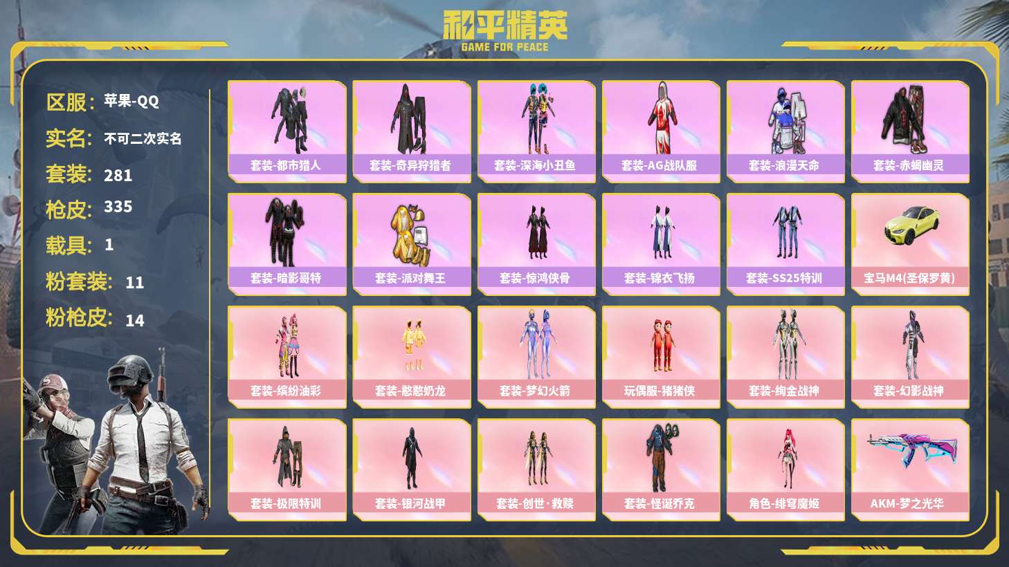 _2288149-可二次-苹果q-6稀有1载具7粉装3特效呛21热门【极品素材身法追猎怪诞乔克(小丑)雪国幻梦木乃伊赤蝎天命洛天依小丑鼻黑色高级特训上衣奇迹天团老6服红眼罩等等】155套装166呛皮57056热力值6印记历史超级王牌16星【6稀有】木乃伊奇异狩猎者赤蝎幽灵akm-缤纷海域akm-百万伏特浪漫天命【1载具】玛莎拉蒂粉色【7粉装】雪国幻梦洛天依水曜玄武怪诞乔克守护骑士数码大师恐龙拽拽【3特效呛】m416-五爪金龙7级mg3-洛神天依6级ump45-恐龙拽拽5级【21热门】龟仙人雪山精英动感兔斯基爱崽白熊梦魇先生鹰眼刺客奇迹天团神秘黑猫暗夜契约暗影哥特纯白誓言豚鼠丹丹漫步者抹茶蜜豆白虎圣者破蛋小黄鸡m416-魔法学院m416-仓鼠灰灰m762-奇异狩猎者m24-奇异狩猎者s686-奇异狩猎者【6头盔】梦幻火箭头盔雪国精灵头盔折纸暴龙头盔水曜玄武头盔百万伏特头盔深海小丑鱼头盔【8背包】精灵迷巫背包雪国精灵背包折纸暴龙背包水曜玄武背包百万伏特背包潮萌小黄鸭背包心之恋语背包夏日绵绵冰背包营地id:595687166
