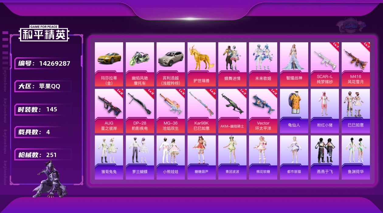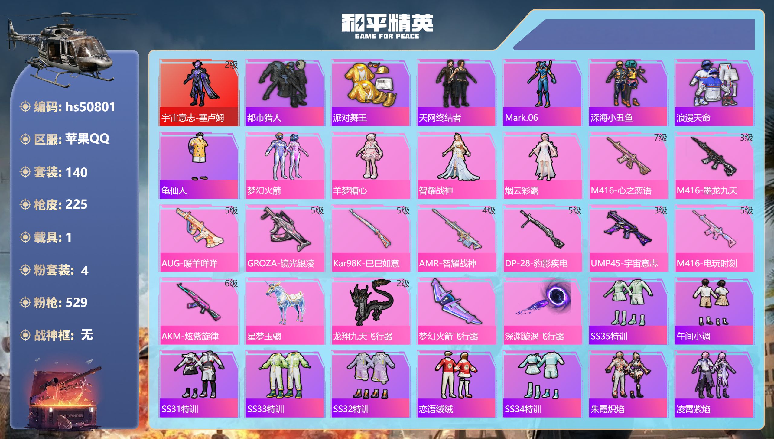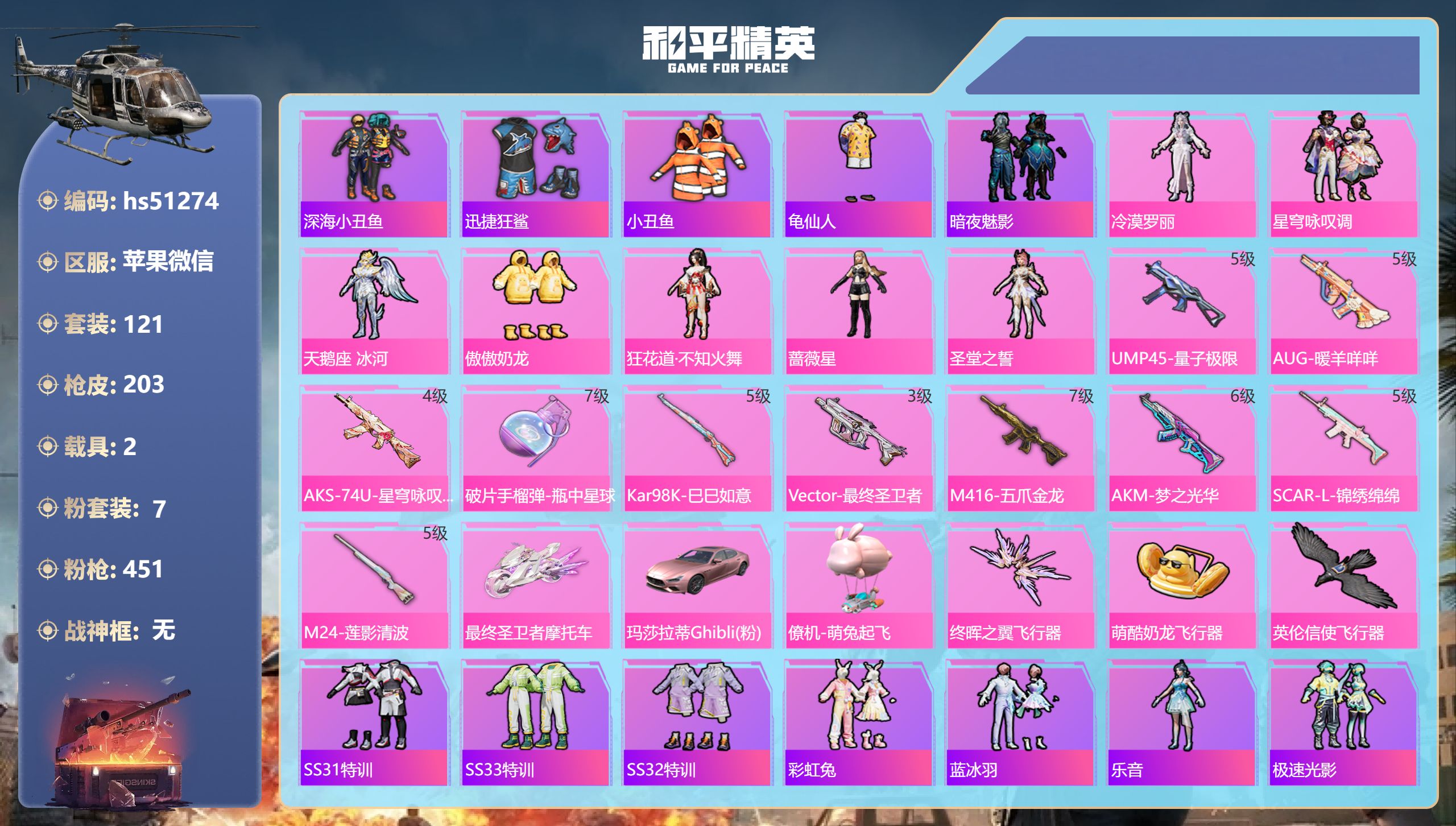 _2288149-可二次-苹果q-6稀有1载具7粉装3特效呛21热门【极品素材身法追猎怪诞乔克(小丑)雪国幻梦木乃伊赤蝎天命洛天依小丑鼻黑色高级特训上衣奇迹天团老6服红眼罩等等】155套装166呛皮57056热力值6印记历史超级王牌16星【6稀有】木乃伊奇异狩猎者赤蝎幽灵akm-缤纷海域akm-百万伏特浪漫天命【1载具】玛莎拉蒂粉色【7粉装】雪国幻梦洛天依水曜玄武怪诞乔克守护骑士数码大师恐龙拽拽【3特效呛】m416-五爪金龙7级mg3-洛神天依6级ump45-恐龙拽拽5级【21热门】龟仙人雪山精英动感兔斯基爱崽白熊梦魇先生鹰眼刺客奇迹天团神秘黑猫暗夜契约暗影哥特纯白誓言豚鼠丹丹漫步者抹茶蜜豆白虎圣者破蛋小黄鸡m416-魔法学院m416-仓鼠灰灰m762-奇异狩猎者m24-奇异狩猎者s686-奇异狩猎者【6头盔】梦幻火箭头盔雪国精灵头盔折纸暴龙头盔水曜玄武头盔百万伏特头盔深海小丑鱼头盔【8背包】精灵迷巫背包雪国精灵背包折纸暴龙背包水曜玄武背包百万伏特背包潮萌小黄鸭背包心之恋语背包夏日绵绵冰背包营地id:595687166