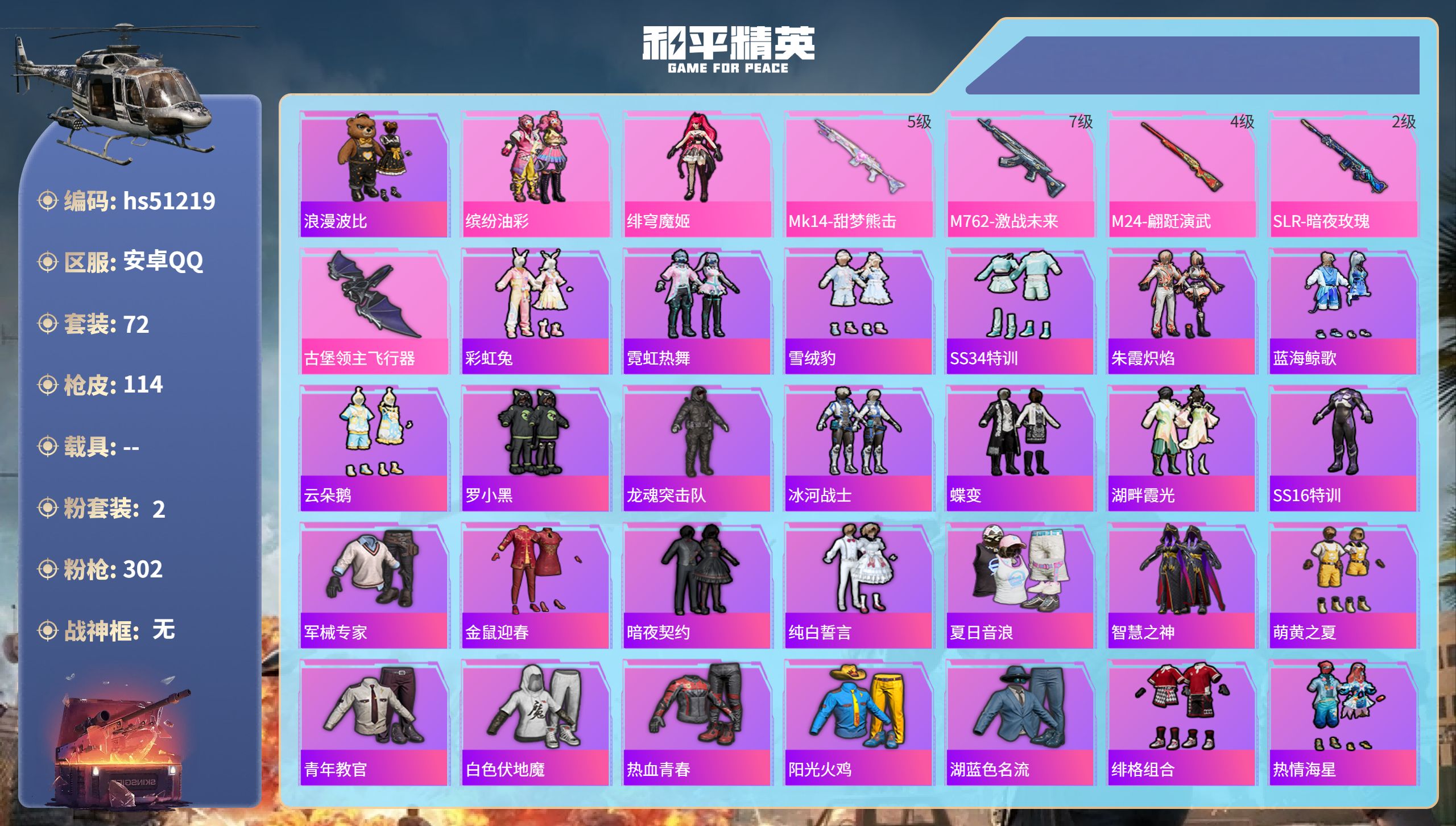 _2288156-可二次安卓q-1红装1稀有4载具21粉装11特效呛10热门174套装229呛皮1红装-2级云鸾猪脸三姐妹放客童趣迷兔小番茄软软马卡龙小可学妹第五大道美雪千金淑猫6满级呛6级ak甜心宝贝88673热力值10印记历史传奇王牌15星【1红装】盛世惊鸿-云鸾2级【1稀有】浪漫天命【4载具】宝马m4圣保罗黄萌喵橘座晶梦灵驹星梦玉骢【21粉装】美雪蜜语绒猫宝贝奶油派天使彩虹糖甜心巧克力千金淑猫异瞳寒姬樱桃泡泡绯月迷踪守护天翼呆萌星弥小可学妹垂柳戏鸭缤纷油彩放客神游第五大道童趣迷兔冰霜白皇炙焰红王彩虹甜喵蜜桃特工【11特效呛】m416-电玩时刻5级akm-甜心宝贝6级kar98k-巳巳如意5级dp-28-千金淑猫5级svd-月影灵韵2级aug-暖羊咩咩5级mk14-盛世惊鸿3级m249-彩虹甜喵7级sks-碧影闪光4级破片手留单-粉粉猫爪7级盐雾蛋-丁香清露5级【10热门】龟仙人红熊茄茄软软马卡龙晶辉守护小狗蛇点点大橘为重暗夜契约团圆交子纯白誓言破蛋小黄鸡【2飞行器】龙翔九天飞行器相思残雪飞行器【1头盔】甜心宝贝头盔【2背包】甜心宝贝背包甜蜜誓约背包营地id:756618032