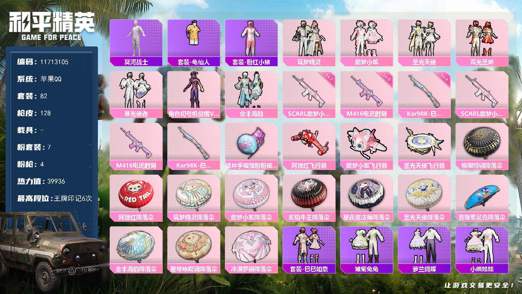_2287947-可二次苹果q-网络风险稳定后可解除【精品少萝宝宝公主女号60级收藏家双字id满级暖熊m4巧克力三姐妹猪妹小狐洛天依寒光使者恐龙拽拽冰川蜜桃特工卤蛋头蓝螳螂波比夏雨游龙天籁歌者惊鸿侠骨萌趣咩咩娇憨猪猪雪鹰学院ak甜心宝贝丝噶童趣】16粉装8特效呛13热门117套装162呛皮53127热力值10印记历史超级王牌10星【16粉装】宝贝奶油派天使彩虹糖甜心巧克力洛天依缤纷油彩莲影清波星之信仰炙焰红王霁雪冰心傲雪凌霜甜梦小狐音爆索尼克冰川红玫蜜桃特工恐龙拽拽寒光使者【8特效呛】m416-五爪金龙1级m416-心之恋语1级akm-甜心宝贝6级kar98k-巳巳如意4级ump45-量子极限5级scar-l-童趣迷兔5级m416-暖熊萌萌7级mg3-洛神天依5级【13热门】mark.06龟仙人鹰眼刺客蔷薇魔法师奶芙汪汪恶魔喵喵浪漫波比粉红小猪豚鼠丹丹漫步者弄潮海豚m416-魔法学院aug-魔法学院【1飞行器】精灵迷巫飞行器【2头盔】精灵迷巫头盔甜心宝贝头盔【2背包】精灵迷巫背包甜心宝贝背包营地id:791374892