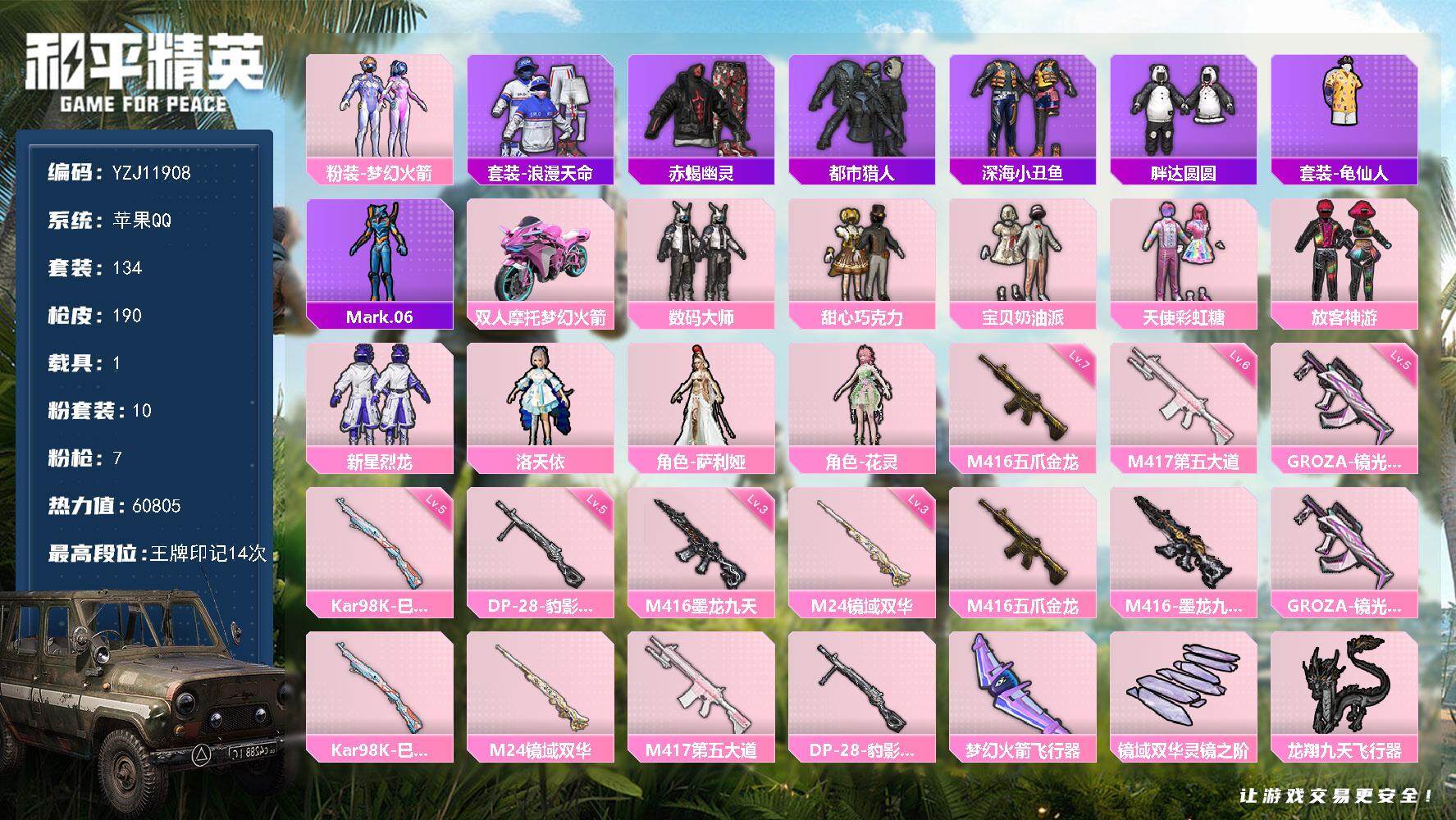 _2287936-可二次苹果q-4稀有1载具10粉装7特效呛10热门134套装190呛皮60805热力值身法素材号广州tt粉丝标388扭蛋碎片梦幻火箭巧克力三姐妹洛天依小白龙都市赤蝎led发光眼罩胖达tt追光队服tt战队服深海小丑鱼东方飞龙3级m4墨龙九天3级m24镜域双华满级m4五爪金龙14印记历史超级王牌20星【4稀有】赤蝎幽灵akm-百万伏特都市猎人浪漫天命【1载具】双人摩托梦幻火箭【10粉装】梦幻火箭萨利娅宝贝奶油派天使彩虹糖甜心巧克力洛天依花灵放客神游数码大师新星烈龙【7特效呛】m416-五爪金龙7级m416-墨龙九天3级kar98k-巳巳如意5级dp-28-豹影疾电5级m24-镜域双华3级groza-镜光银凌5级m417-第五大道6级【10热门】mark.06龟仙人东方飞龙鹰眼刺客深海小丑鱼胖达圆圆tt追光队服tt战队服漫步者破蛋小黄鸡【2飞行器】龙翔九天飞行器梦幻火箭飞行器【2头盔】梦幻火箭头盔甜心宝贝头盔【3背包】梦幻火箭背包甜心宝贝背包深海小丑鱼背包营地id:785269369