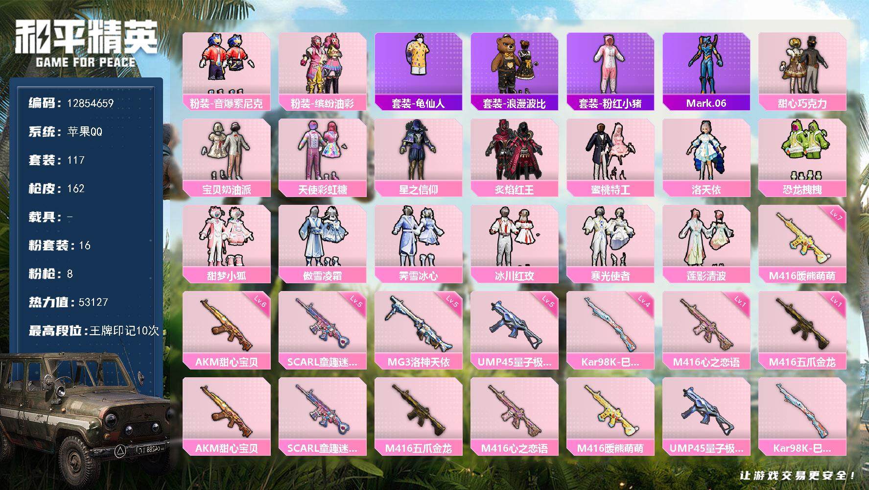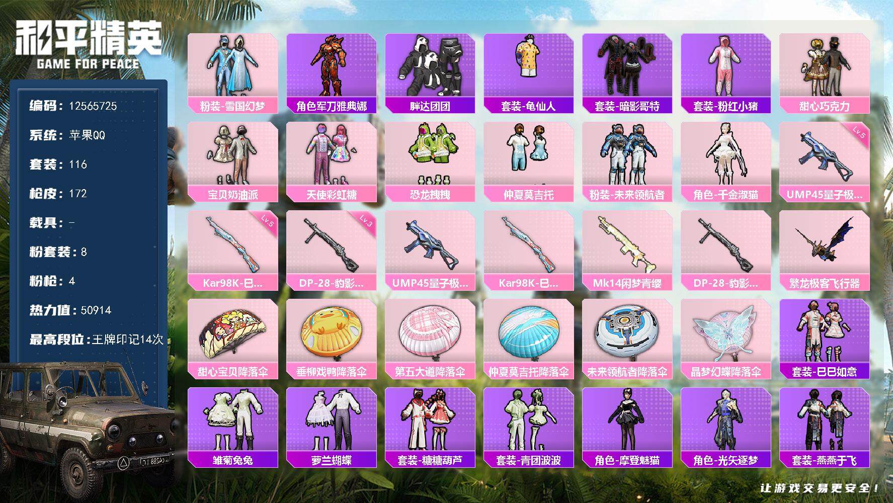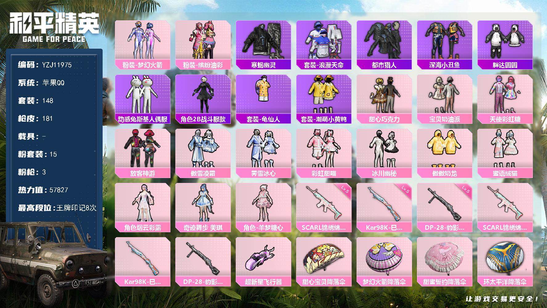 _2287938-可二次-苹果q-8粉装4特效呛16热门116套装172呛皮50602热力值精品公主号79000服饰币1200物资币雪国甜心三姐妹千金淑猫仲夏莫吉托胖达云朵鹅雪绒豹红眼罩夏日倾情缤纷果语满级mk14闲梦青缨特效呛全满级雪国精灵头盔背包一套14印记历史超级王牌14星【8粉装】雪国幻梦宝贝奶油派天使彩虹糖甜心巧克力千金淑猫未来领航者仲夏莫吉托恐龙拽拽【4特效呛】kar98k-巳巳如意5级dp-28-豹影疾电3级ump45-量子极限5级mk14-闲梦青缨7级【16热门】龟仙人鹰眼刺客迅捷狂鲨胖达团团暗影哥特团圆交子瑞龙福将粉红小猪漫步者风华少年志军刀雅典娜弄潮海豚akm-奇异狩猎者m762-奇异狩猎者m762-瑞龙福将s686-奇异狩猎者【1飞行器】繁龙极客飞行器【3头盔】雪国精灵头盔甜心宝贝头盔深海小丑鱼头盔【2背包】雪国精灵背包甜心宝贝背包营地id:764006553
