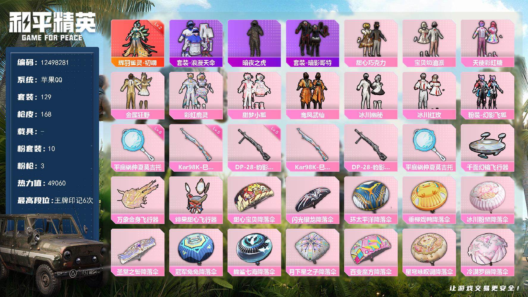 _2287946-可二次-苹果q-1红装3稀有10粉装3特效呛9热门129套装168呛皮49060热力值精品小女号2级孔雀甜心三姐妹甜梦小狐暗夜之虎白糯汤圆都市丽猫幻彩翩翩萌鸡速递红眼罩6级平底锅仲夏莫吉托甜心宝贝头盔背包一套6印记历史传奇王牌15星【1红装】辉羽雀灵-初翊2级【3稀有】awm-黄金龙骨akm-缤纷海域浪漫天命【10粉装】宝贝奶油派天使彩虹糖甜心巧克力金属狂野幻影飞狐冰川幽秘鸾凤武仙甜梦小狐冰川红玫彩虹鹿灵【3特效呛】kar98k-巳巳如意5级dp-28-豹影疾电5级平底锅-仲夏莫吉托6级【9热门】暗夜之虎鹰眼刺客暗夜之虎暗影哥特狂沙舞者抹茶蜜豆破蛋小黄鸡极速红龙m762-奇异狩猎者【1飞行器】千面幻镜飞行器【2头盔】甜心宝贝头盔金羽特工头盔【2背包】甜心宝贝背包金羽特工背包营地id:767002755