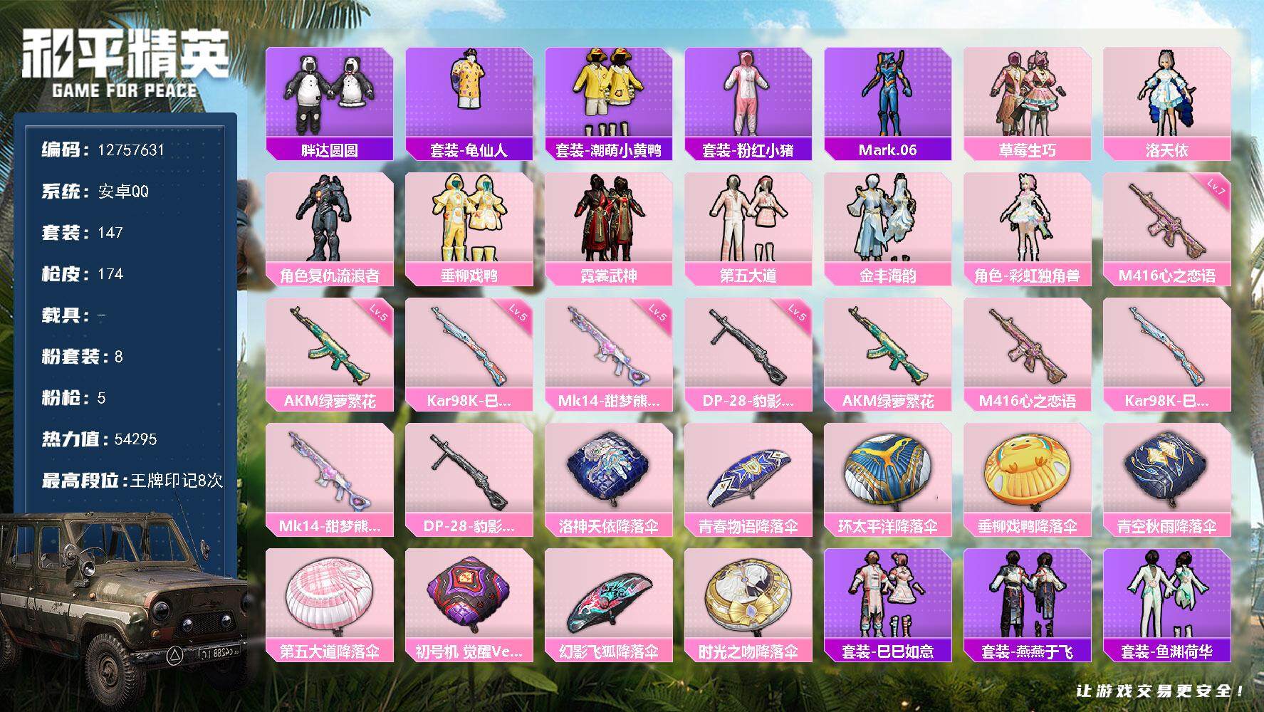 2287791-可二次 安卓q-8粉装5特效呛13热门147套装174呛皮 54172热力值 精品小女号 洛天依 第五大道 彩虹独角兽 垂柳戏鸭 胖达 小黄鸭 激萌罗小黑 云朵鹅 雪绒豹 满级m4心之恋语 特效呛全满级 8印记 历史超级王牌7星 【8粉装】 洛天依 金丰海韵 彩虹独角兽 霓裳武神 垂柳戏鸭 第五大道 草莓生巧 复仇流浪者 【5特效呛】 m416-心之恋语 7级 akm-绿