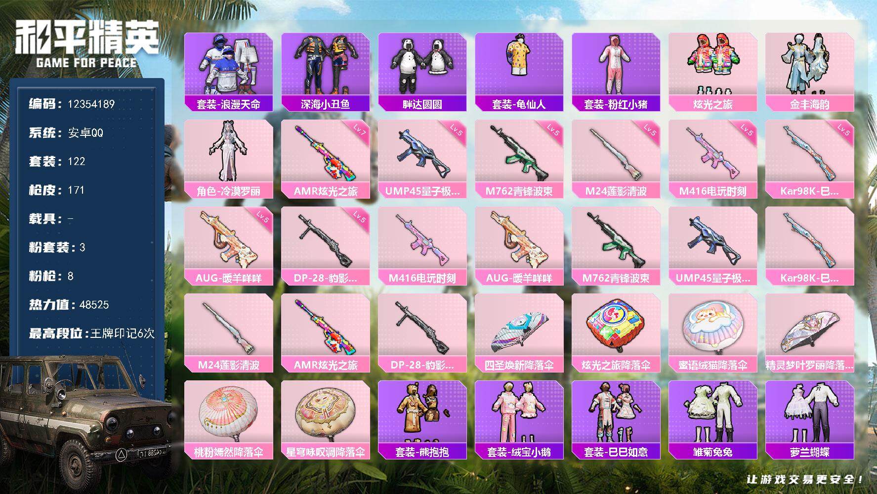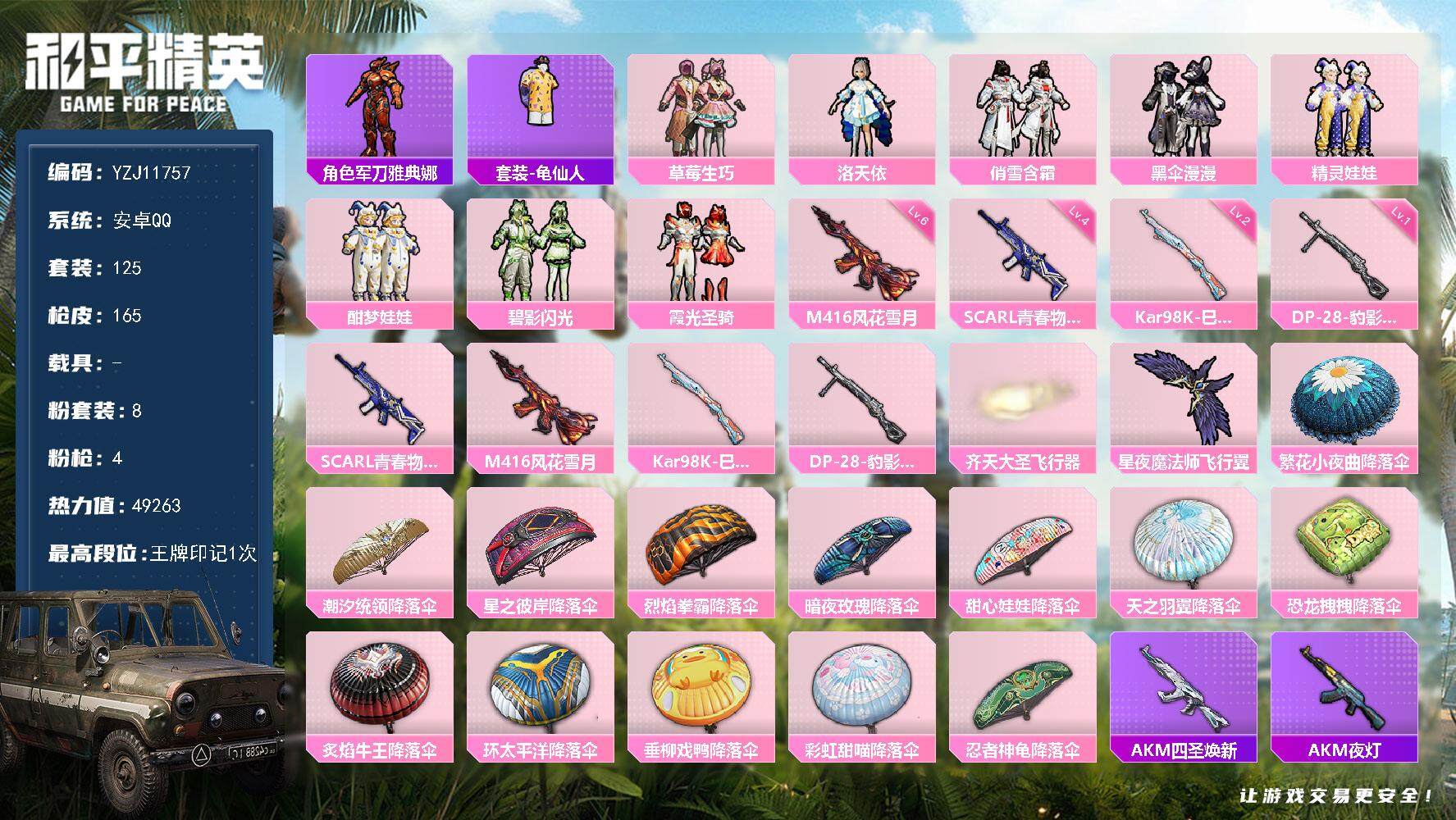 2287786-可二次 安卓q-8粉装4特效呛15热门 小女号 洛天依 草莓 精灵娃娃 风花雪月6级 青春物语4级 螃蟹头 125套装165呛皮 49263热力值 1印记 历史超级王牌1星 【8粉装】 洛天依 酣梦娃娃 精灵娃娃 草莓生巧 霞光圣骑 俏雪含霜 黑伞漫漫 碧影闪光 【4特效呛】 kar98k-巳巳如意 2级 dp-28-豹影疾电 1级 m416-风花雪月 6级 s
