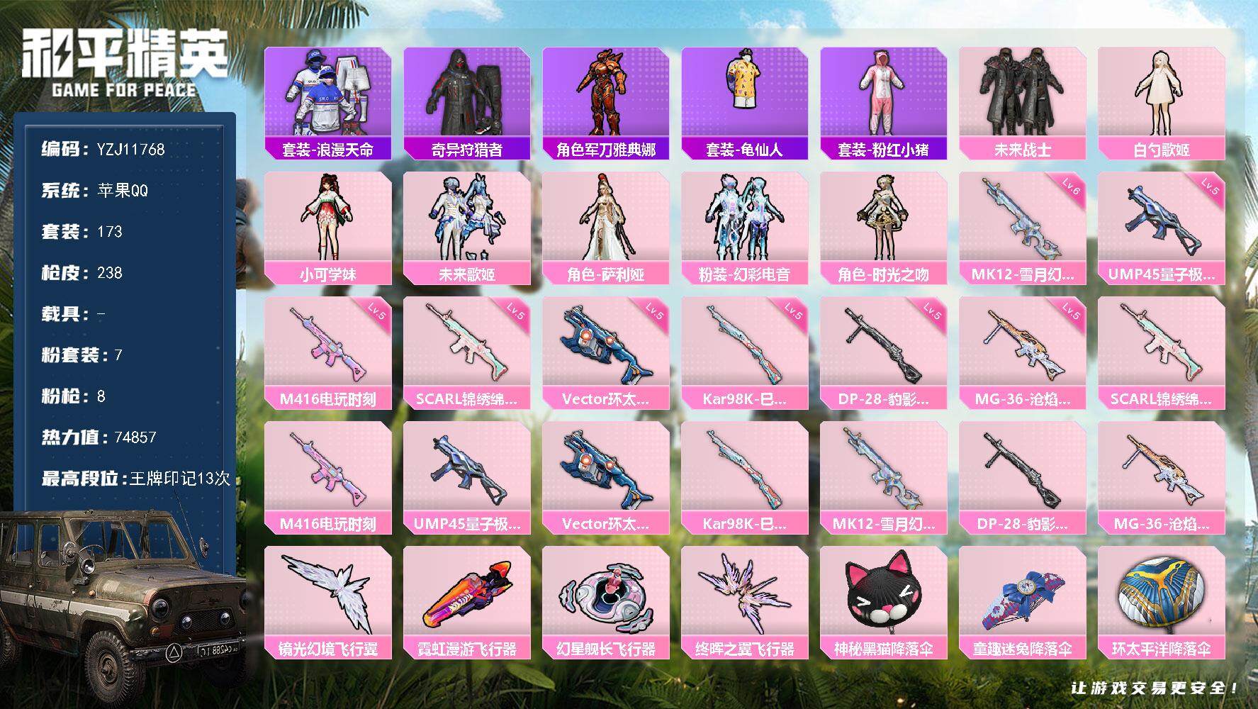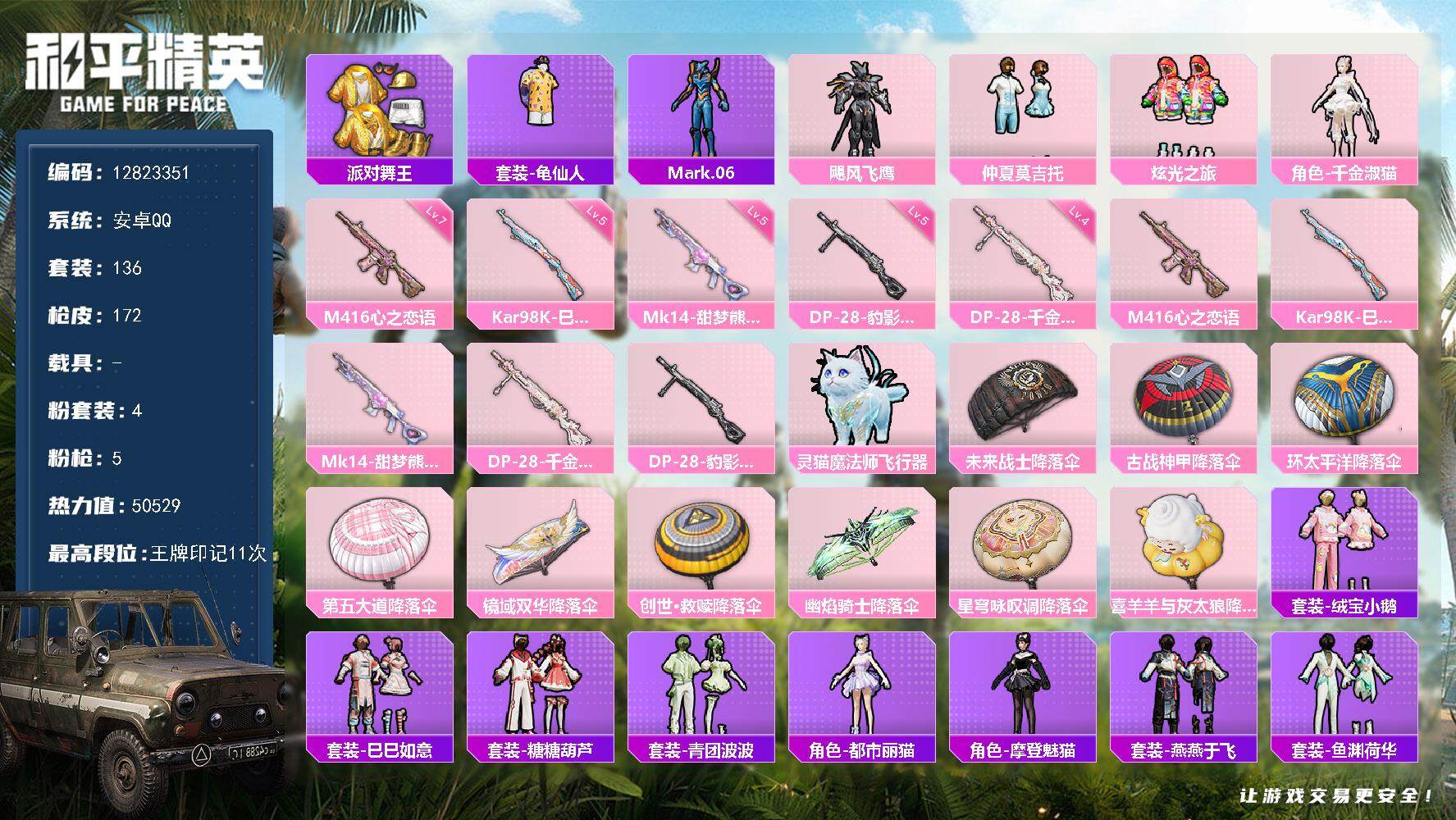 _2287736-可二次安卓q-2稀有4粉装5特效呛6热门精品小女号千金淑猫泳衣金鞋蓝螳螂纯白誓言都市丽猫强哥彩虹兔m4心之恋语满级mk14甜梦5级136套装172呛皮50529热力值11印记历史卓越王牌11星【2稀有】派对舞王派对舞王(金靴子)【4粉装】千金淑猫炫光之旅仲夏莫吉托飓风飞鹰【5特效呛】m416-心之恋语7级kar98k-巳巳如意5级dp-28-千金淑猫4级dp-28-豹影疾电5级mk14-甜梦熊击5级【6热门】mark.06龟仙人鹰眼刺客纯白誓言漫步者破蛋小黄鸡【1头盔】甜蜜誓约头盔营地id:946983168