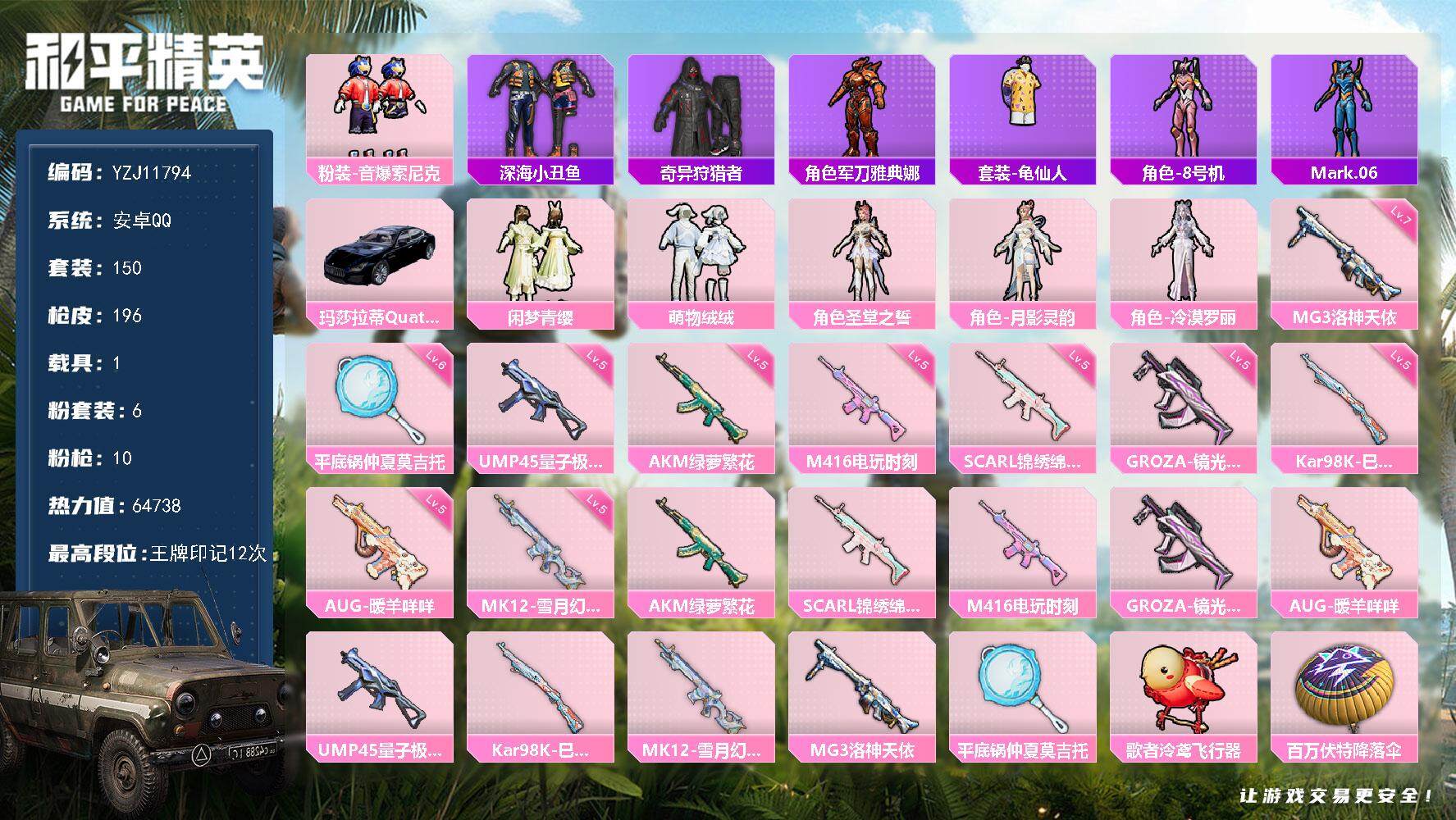 2287790-可二次 安卓q-1稀有1载具6粉装10特效呛10热门 身法小号 带地铁 十款不重复特效 索尼克 绒绒 粉螳螂 蓝螳螂 深海小丑鱼 雅典娜 m4电玩满级 aug暖羊满级 mg3天依满级 149套装196呛皮 64618热力值 12印记 历史超级王牌11星 【1稀有】 奇异狩猎者 【1载具】 玛莎拉蒂q蓝色 【6粉装】 圣堂之誓 月影灵韵 冷漠罗丽 闲梦青缨 萌物绒绒 音爆索尼