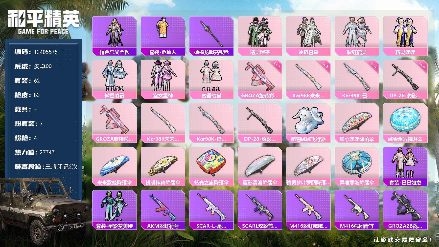 _2287731-q-7粉装-4特效呛-0载具-1粉色飞行器-27747热力值-2王牌印记-62套装-83呛皮 【热门品类】:角色-忠义严颜,套装-龟仙人,撬棍-龙胆亮银呛 【粉色套装】:粉装-精灵迷巫,粉装-冰霜白皇,粉装-彩虹鹿灵,粉装-精灵娃娃,粉装-傲雪凌霜,粉装-室女星神,粉装-蜜语绒猫 【粉色呛皮等级】:groza-旋转彩虹七级,kar98k-未来歌姬五级,kar98k-巳巳如意五级,dp-28-豹影疾电四级 【粉色呛皮】:groza-旋转彩虹,kar98k-未来歌姬,kar98k-巳巳如意,dp-28-豹影疾电 【粉色飞行器】:萌物绒绒飞行器 【粉色降落伞】:甜心娃娃降落伞,绒雪飘舞降落伞,未来歌姬降落伞,拂晓神骑降落伞,炫光之旅降落伞,莲影清波降落伞,精灵梦叶罗丽降落伞,异瞳寒姬降落伞 【稀有套装】:套装-龟仙人,套装-巳巳如意,套装-星影赞美诗 【稀有呛皮】:akm-彩虹符号,scar-l-是爱神辣,scar-l-炫彩节奏,m416-彩虹嘻嘻猴,m416-糯团青竹,groza-2b战斗服款,groza-懵萌河马,aug-天降萌叽,aug-耀粉歌者,m762-天降萌叽,m762-甜心宝贝,m762-绯红前夜,g36c-懵萌河马,ac-val-快闪甜心,uzi-啾咪啾咪,uzi-金风玉露,ump45-炫光之旅,ump45-生命誓言,vect-彩虹符号,vect-龙行天下,汤姆逊-天降萌叽,汤姆逊-甜梦小狐,汤姆逊-耀粉歌者,野牛-天星战神,aks-74u-鬼刀,p90-倾城蜜语,p90-快闪甜心,kar98k-梦幻火箭,m24-拂晓神骑,m24-幻彩电音,sks-糯团青竹,mini14-耀粉歌者,莫辛纳甘-懵萌河马,m417-惊鸿侠骨,mk20-h-快闪甜心,m200-惊鸿侠骨,s686-生命誓言,s12k-龙虾霸霸,dbs-月下星之子,m249-彩虹符号,m249-莲影清波,mg3-惊鸿侠骨,mg3-第五大道,pkm-懵萌河马,蝎式手呛-闲梦青缨,蝎式手呛-千金淑猫,沙墨之鹦-快闪甜心,tmp-9-江南烟雨,tmp-9-未来歌姬,爆炸猎弓-惊鸿侠骨,大砍刀-2p战斗服款 【其他套装】:套装-ss22特训,套装-ss23特训,套装-ss24特训,套装-ss25特训,套装-ss26特训,套装-ss27特训,套装-ss28特训,套装-ss2