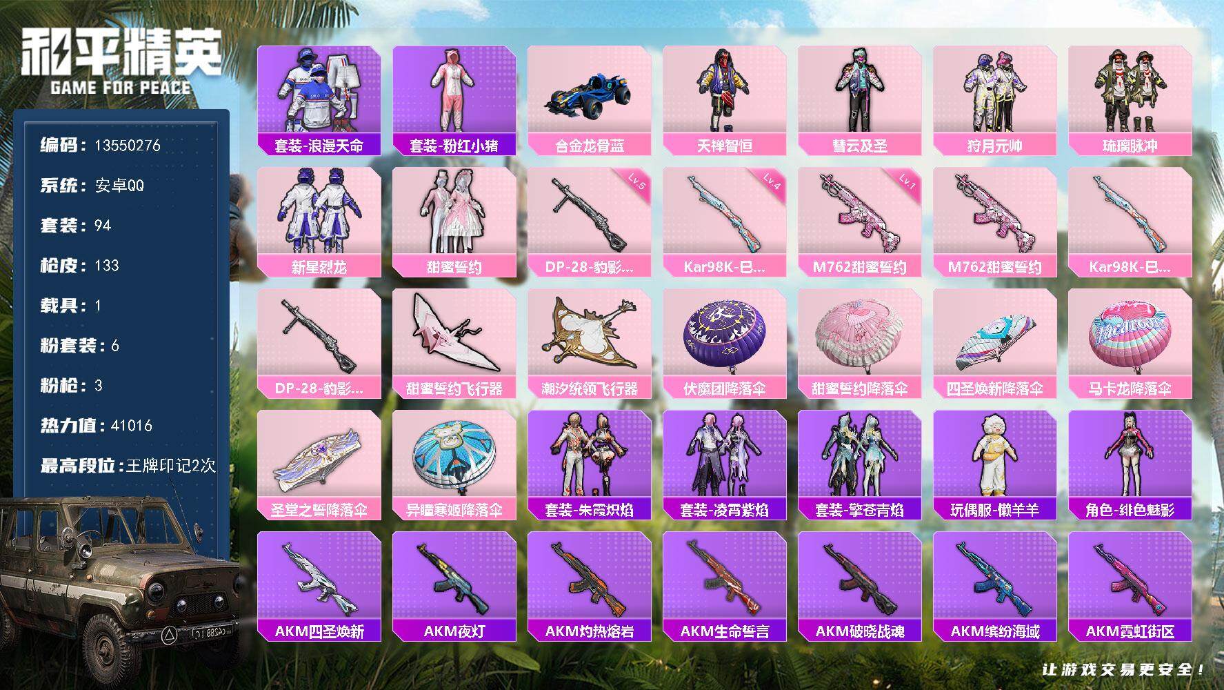 _2287723-可二次安卓q-2稀有1载具6粉装3特效呛9热门94套装133呛皮41016热力值2印记1卓越1传奇1绝世小白龙蓝蹦蹦天命甜蜜誓约破蛋小黄鸡历史绝世王牌12星【2稀有】akm-缤纷海域浪漫天命【1载具】合金龙骨蓝色【6粉装】天禅智恒彗云及圣狩月元帅琉璃脉冲新星烈龙甜蜜誓约【3特效呛】kar98k-巳巳如意4级m762-甜蜜誓约1级dp-28-豹影疾电5级【9热门】青涩年华暗夜契约纯白誓言粉红小猪白虎圣者朱雀圣者破蛋小黄鸡极速红龙m762-奇异狩猎者【2飞行器】潮汐统领飞行器甜蜜誓约飞行器【1头盔】甜蜜誓约头盔【2背包】百万伏特背包甜蜜誓约背包营地id:713233576