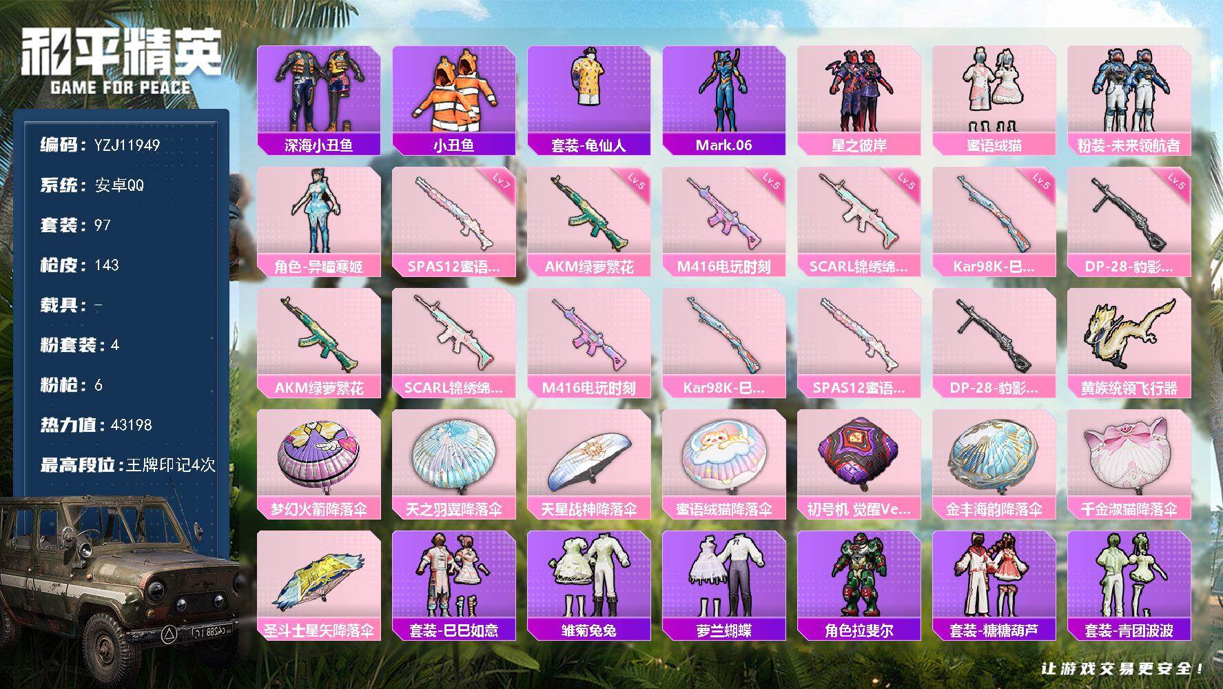 _2287729-可二次安卓q-4粉装6特效呛6热门97套装143呛皮43158热力值精氪小号蜜语绒猫异瞳寒姬星之彼岸小丑鱼满级m4电玩满级spas12蜜语绒猫满级斯嘎锦绣绵绵4印记历史超级王牌7星【4粉装】蜜语绒猫异瞳寒姬未来领航者星之彼岸【6特效呛】scar-l-锦绣绵绵5级m416-电玩时刻5级akm-绿萝繁花5级kar98k-巳巳如意5级spas-12-蜜语绒猫7级dp-28-豹影疾电5级【6热门】mark.06小丑鱼龟仙人梦魇先生呆萌铁蟹深海小丑鱼【2飞行器】炎氏战神飞行翼黄族统领飞行器营地id:936951476