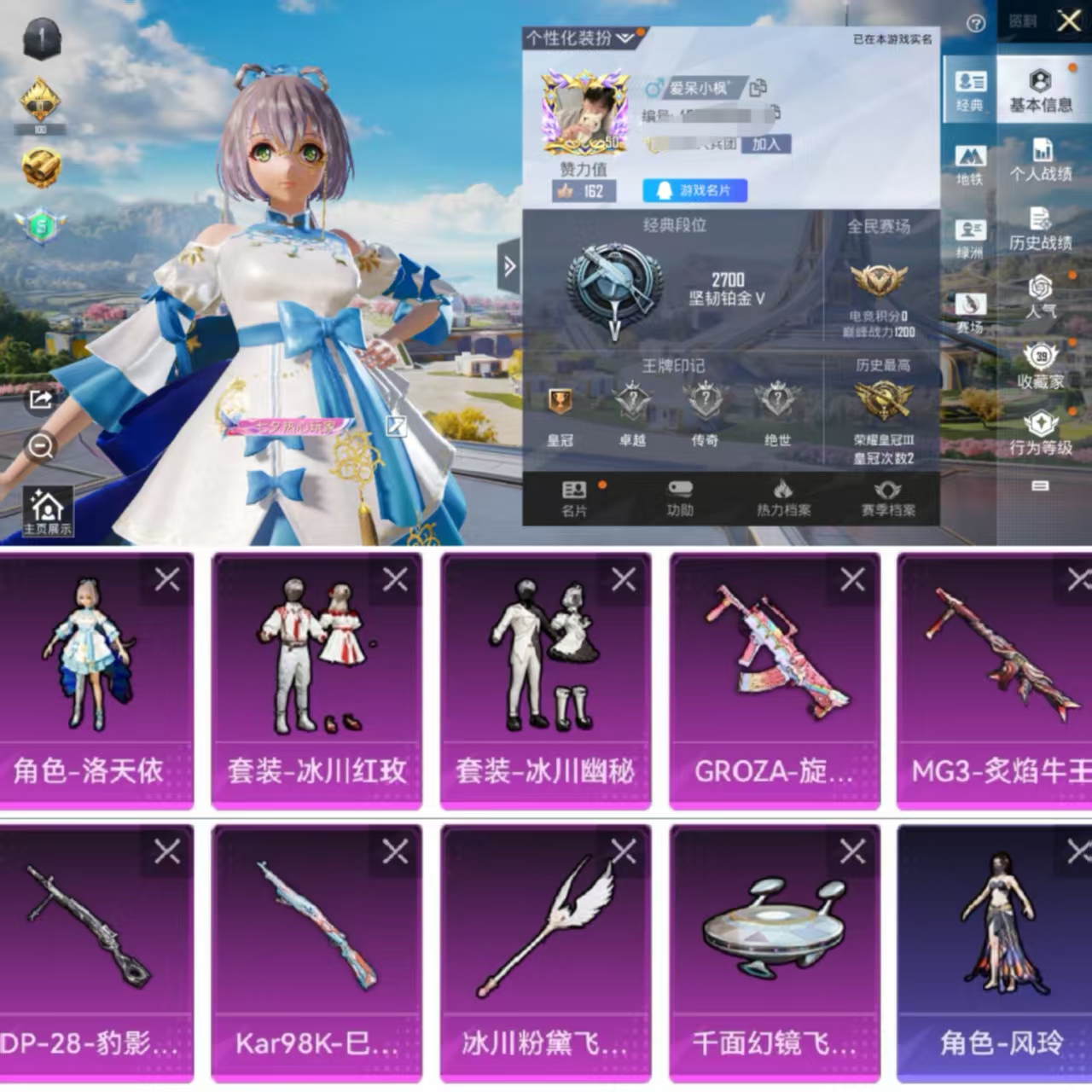 0载具-107套装-137呛皮-h6352无二次 安卓q-段位铂金 6印记 107套装137呛皮 【1粉装】 角色-美雪 【4特效】 m416-电玩时刻 5级 aug-暖羊咩咩 5级 dp-28-豹影疾电 5级 kar98k-巳巳如意 5级 【2飞行器】 星夜魔法师飞行器 鸿潮鸣舰飞行器 【热门】 角色-mark.06 角色-情公主 角色-糖霜甜心 角色-狂花道·娜可露露 玩偶服-卖仔青蛙 角色-冰公主 0违规