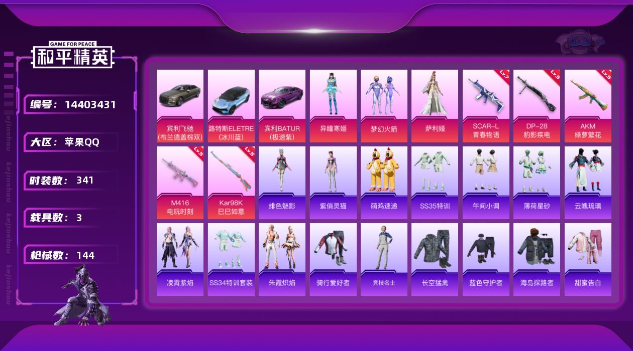 3粉装 5特效呛 3载具 7印记 可二次 可修改实名 【热门装扮】:萨利娅异瞳寒姬梦幻火箭新101 【载具】:路特斯eletre冰川蓝宾利batur极速紫宾利飞驰布罗德盖棕双色 【稀有呛皮】:kar98k-巳巳如意m416电玩时刻dp-28-豹影疾电scar-l青春