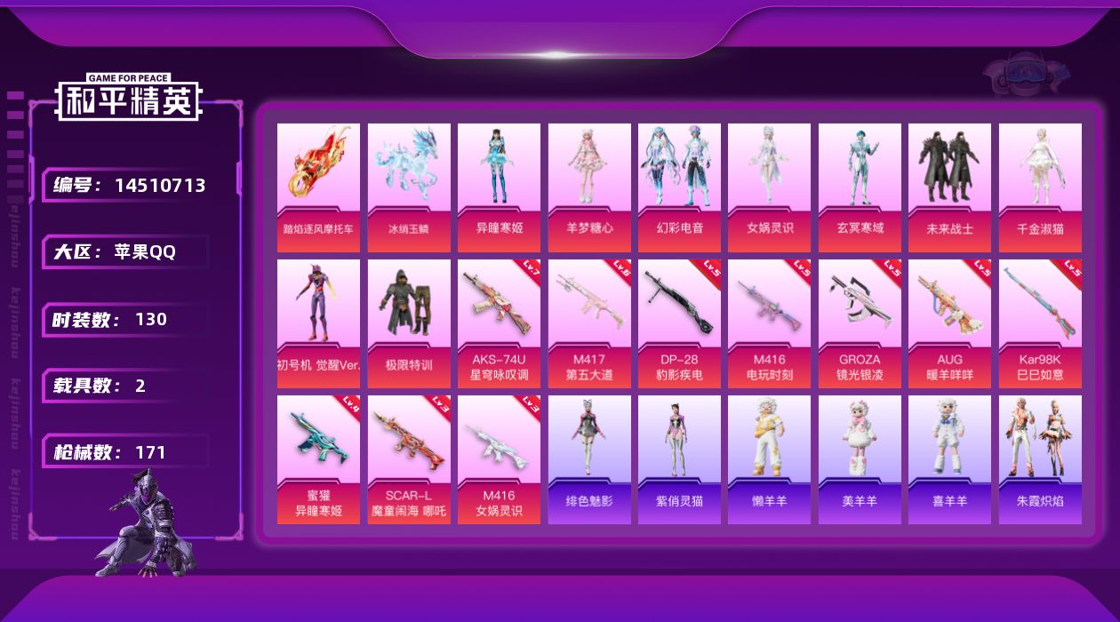 [14510713]苹果 手q-10粉装-11特效呛-2载具-6粉色飞行器-55450热力值-7王牌印记-130套装-171呛皮 【热门品类】:粉装-梦幻火箭,套装-寒蝎幽灵,套装-浪漫天命,套装-都市猎人,套装-派对舞王,套装-深海小丑鱼,套装-小丑鱼,套装-奇异狩猎者,套装-胖达团团,套装-暗影哥特,角色-mark.06 【粉色载具】:踏焰逐风摩托车,冰绡玉鳞 【粉色套装】:粉装-极限特训,粉装-未来战士,粉装-梦幻火箭,角色-初号机 觉醒ver.,角色-千金淑猫,角色-女娲灵识,角色-玄冥寒域,粉装-幻彩电音,角色-羊梦糖心,角色-异瞳寒姬 【粉色呛皮等级】:scar-l-魔童闹海 哪吒三级,m416-电玩时刻五级,m416-女娲灵识三级,groza-镜光银凌五级,aug-暖羊咩咩五级,蜜獾-异瞳寒姬四级,aks-74u-星穹咏叹调七级,kar98k-巳巳如意五级,mk14-甜梦熊击五级,m417-第五大道六级,dp-28-豹影疾电五级 【粉色呛皮】:scar-l-魔童闹海 哪吒,m416-电玩时刻,m416-女娲灵识,groza-镜光银凌,aug-暖羊咩咩,蜜獾-异瞳寒姬,aks-74u-星穹咏叹调,kar98k-巳巳如意,mk14-甜梦熊击,m417-第五大道,dp-28-豹影疾电 【粉色飞行器】:天之羽翼飞行器,星夜魔法师飞行翼,飞天猪飞行器,灵珠游龙飞行器 【粉色降落伞】:未来战士降落伞,梦幻火箭降落伞,星夜魔法师降落伞,千面幻镜降落伞,第五大道降落伞,萌物绒绒降落伞,创世·救赎降落伞,金丰海韵降落伞,鬼刀降落伞,樱桃泡泡降落伞,圣域龙灵降落伞,喜羊羊与灰太狼降落伞,魔童闹海 哪吒降落伞,魔童闹海 敖丙降落伞,异瞳寒姬降落伞 【稀有套装】:套装-巳巳如意,套装-雏菊兔兔,套装-萝兰蝴蝶,套装-小熊娃娃,套装-先驱飞行员,套装-糖糖葫芦,套装-青团波波,套装-棉花软糖,角色-光矢逐梦,套装-燕燕于飞,套装-鱼渊荷华,套装-晶辉守护,角色-糖霜甜心,套装-雪夜云雾,套装-粉恋花,套装-紫幽梦,套装-蓝冰羽,套装-虚空漩涡,套装-朱霞炽焰,套装-凌霄紫焰,套装-擎苍青焰,玩偶服-懒羊羊,玩偶服-美羊羊,玩偶服-喜羊羊,角色-绯色魅影,角色-紫俏灵猫,套装-炫彩糖果 【稀有呛皮】:aug-冰晶雪宝,akm-奇异狩猎者,akm-影袭,a